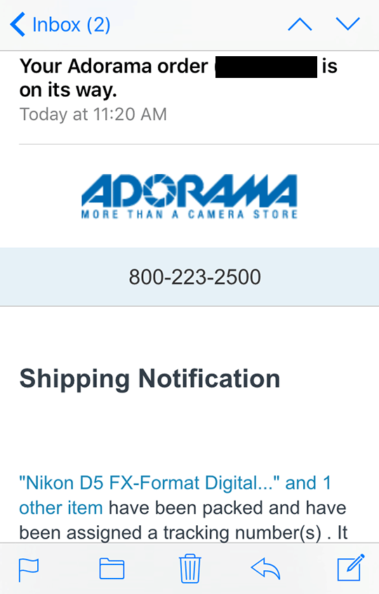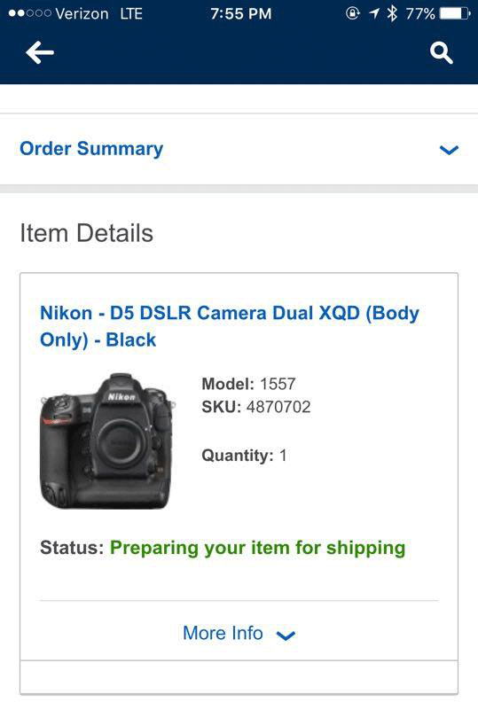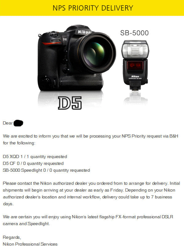 The Nikon D5 camera is now shipping in the US and Europe to both NPS and regular orders. In the US shipping notifications were send from B&H, Adorama, BestBuy and Amazon. The first deliveries are expected on Monday: