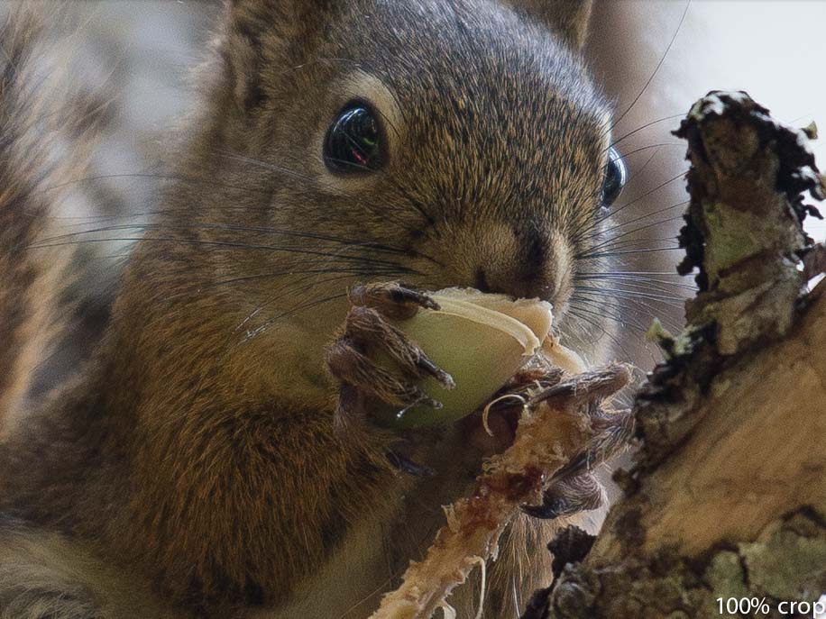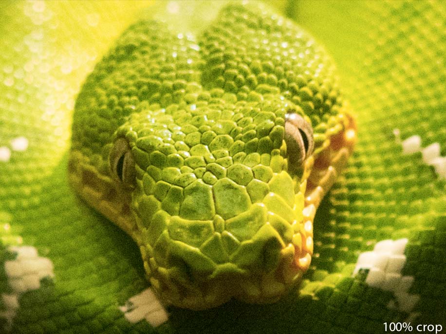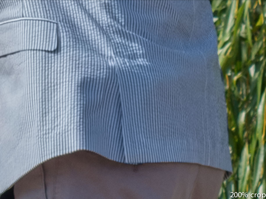 This is a 200% crop from a RAW file. Can you see the strange colours at the left and right of the jacket? I believe JPG output will have some Moiré correction, but in any case, it is easily removed in post.
