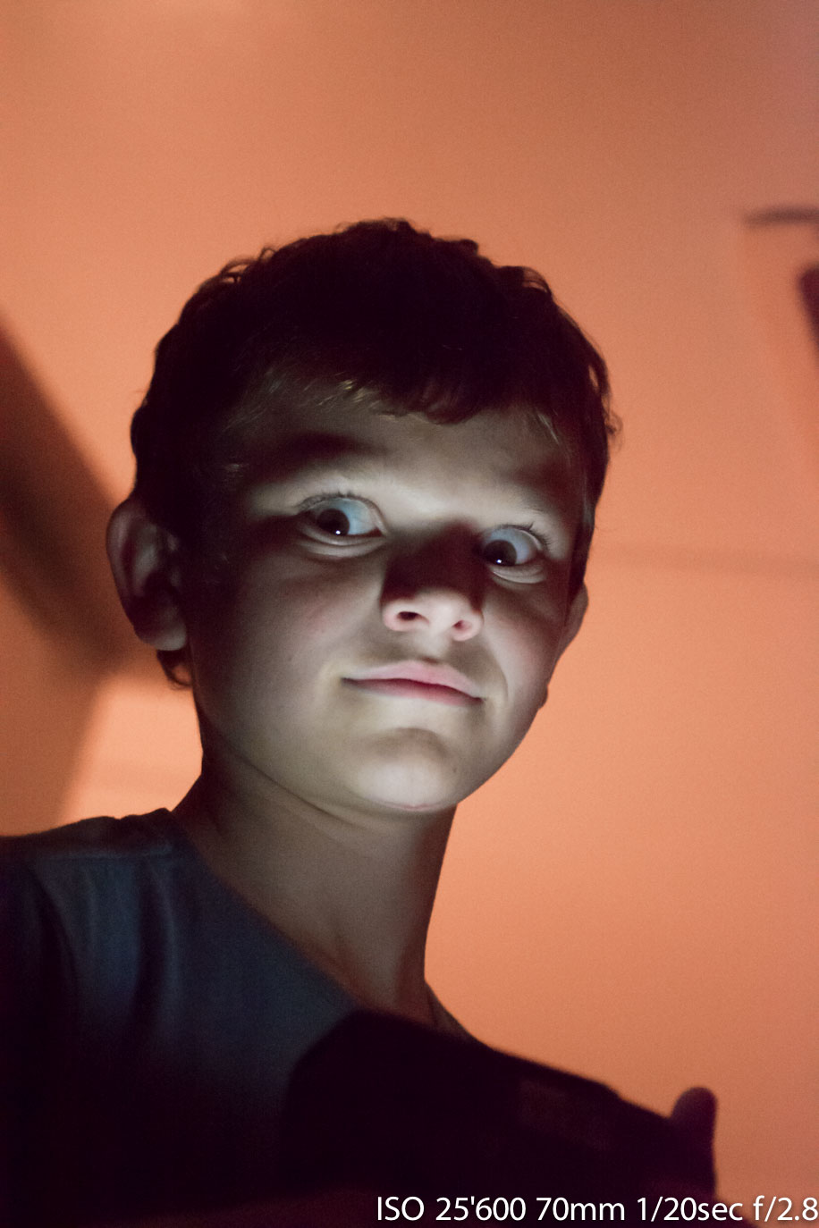 It’s fast. The focus motor is all but silent and the speed from maximum to minimum focus is awesome. Along with the switches and the D7100 51 point AF system you can configure it to grab focus in a fraction of a second. In really low light mine will tend to hunt, but, if you can find enough contrast it will lock on. As you would expect from a lens in this category, there really isn’t much to complain about. The below image of my brother was taken in a cabin lit by candle fire, with a smart phone as light from below. The combo had no problem at this low light of acquiring prompt focus. I have fairly recently started using the AE-L/AF-L button in the AF-ON mode, meaning that the camera will focus when the AE-L/AF-L button is pressed leaving the shutter release button to activate the shutter only. I find it to be the most important change I made in the way I shoot. I usually shoot in AF-C, meaning the focus system tracks the moving subject while the focus button is pressed, however, I can make a shortcut to AF-S, without changing the mode, by simply tapping the AF-ON until focused, then release it and click the shutter.