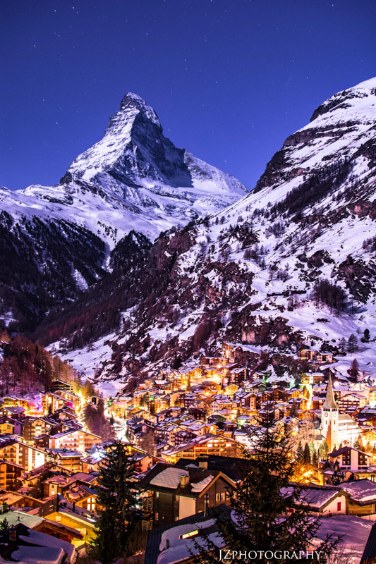 This next location is one that I have wanted to visit ever since I was a little boy. You can clearly see in the image the famous Matterhorn mountain located in the Swiss Alps. This photo was also taken at night. I was able to capture all the detail of the mountains because of the moonlight. I also had my camera set on the incandescent 4 setting giving it a little bit of a purple hue while giving the town lights more contrast and color because of the opposite white balance (this is what I do on nearly all of my night photos). This place was definitely one of the most beautiful places I’ve ever been. Zermatt, Switzerland is a very exclusive town and can only be accessed by train or taxi transportation. And if you want to stay there for a week, well you better get your wallets ready because a Big Mac cheeseburger costs a whopping 11.70 in Swiss francs (12.26 USD).