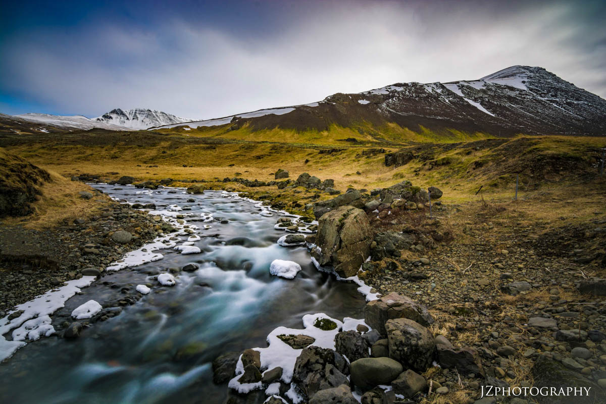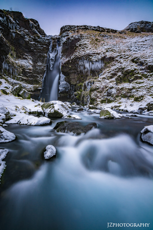 The second image was taken at a not well known waterfall called Gluggafoss. The innkeeper of our previous lodging recommended we go to this waterfall. It was snowing too hard when we went to it but decided to go the next morning. If you saw me taking this image, you would’ve seen how awkward I looked. I was doing a split on two icy rocks while holding my tripod in my right hand and balancing it on another icy rock. I wasn’t able to look at the viewfinder let alone the back of the camera. So I just aligned the image with my sight.