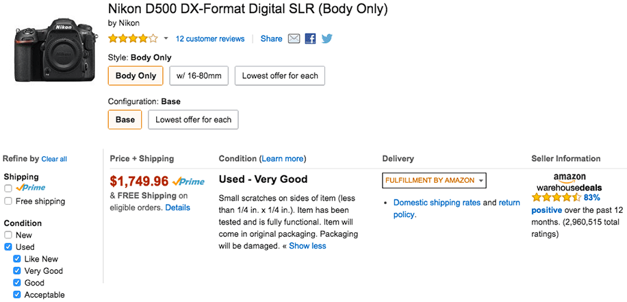Used Nikon D500 cameras are currently available in stock for $1,749 at Amazon WarehouseDeals (fulfilled by Amazon). Those are probably returns from customers and are described as “used – very good” condition. From the Amazon listing: