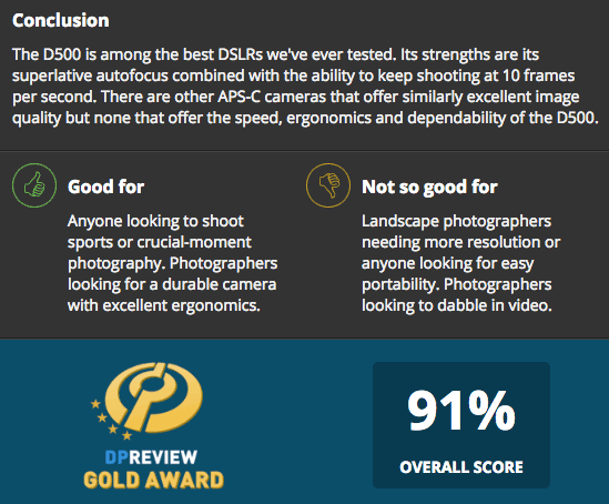 The Nikon D500 got a gold award at dpreview (91%). Their conclusion: