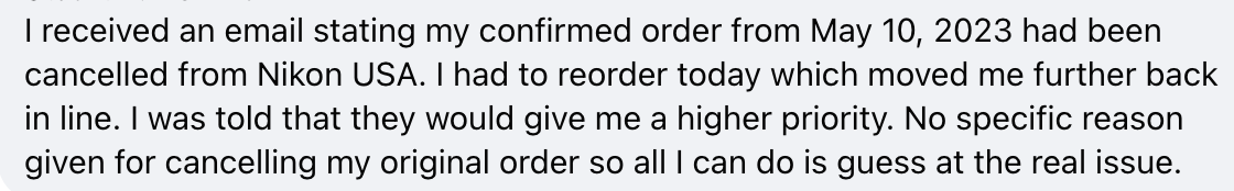 I know of orders placed with Nikon USA for Z mount lenses which were inexplicably cancelled. No explanation from Nikon whatsoever.
