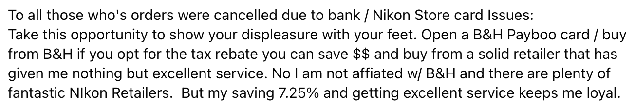 Some readers are discovering why I never recommend buying gear directly from Nikon USA – they have limited resources and are not really set up as a retailer. Amazon also used to cancel orders, but they have been much better lately and I have not heard of any issues. Here is an email I got from a reader: