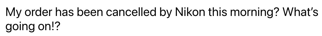 “About your recent article. I too have had my order cancelled. They told me to call my bank. I did, my bank told me they let the transaction through and it was Nikon that cancelled/refunded my order. I have debit and credit showing on my account now. So I do believe it is Nikon screwing things up. I reordered today again and low and behold Nikon cancelled this new order too. I pre-ordered on day 1 and now have to wait for the next batch to ship. This is ridiculous!”