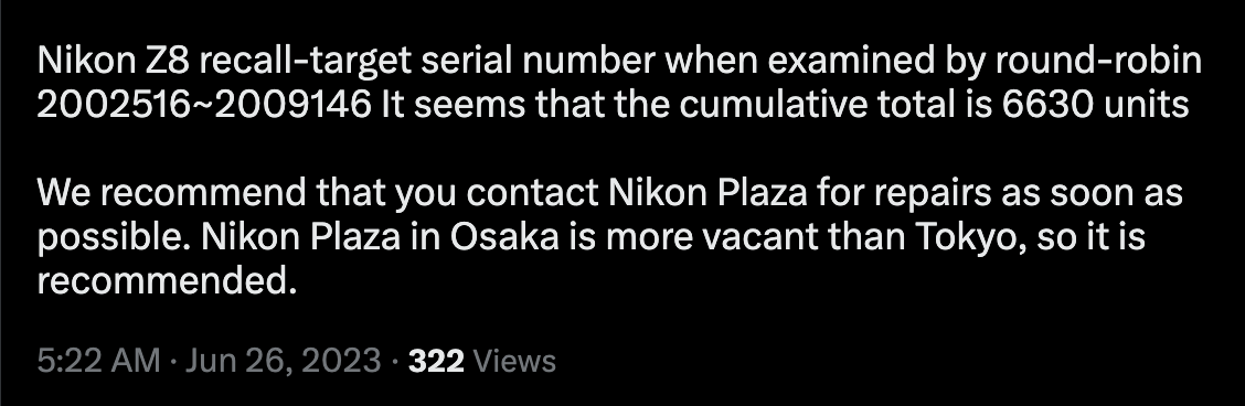 Last week Nikon issued a Z8 service advisory/recall describing an issue where the lens cannot be locked to the camera. A reader sent me this email regarding what and how many serial numbers could be affected: