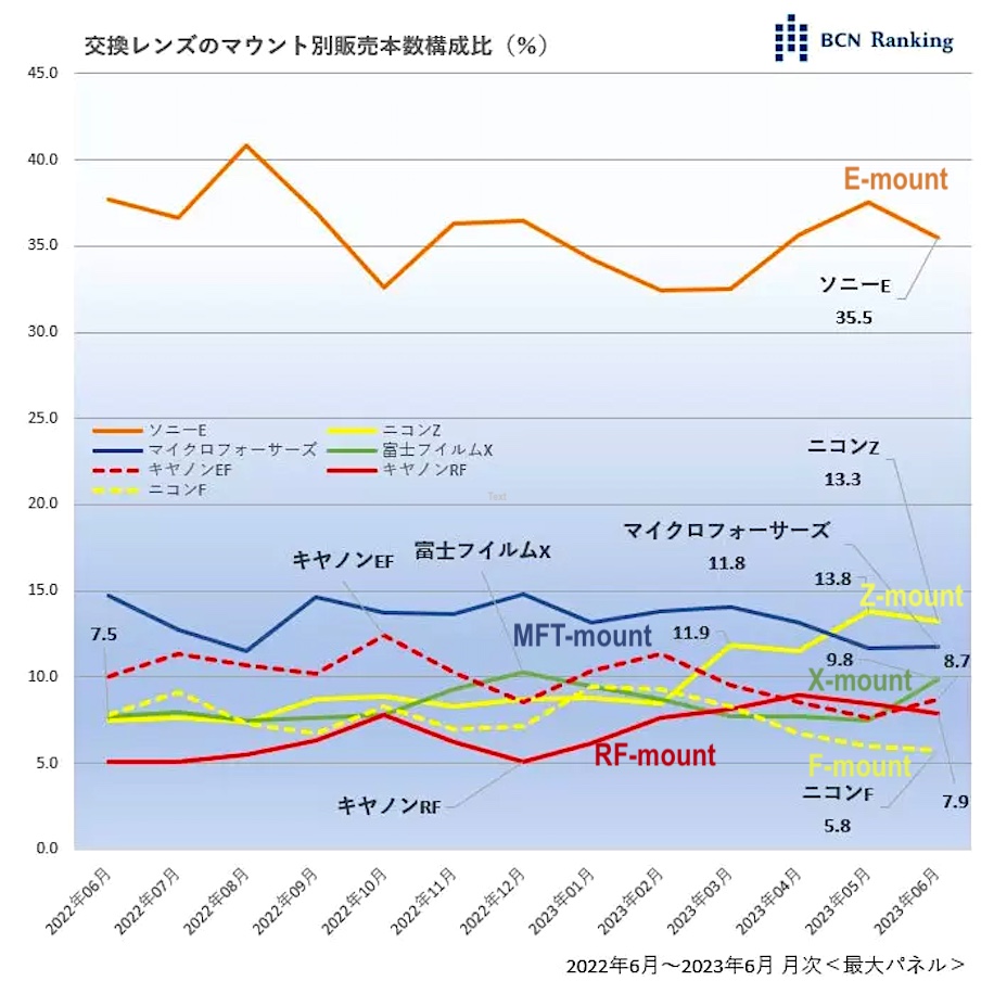 “However, it was Nikon’s Z-mount lens for mirrorless single-lens cameras that increased its share from 5th place in June last year to 2nd place this June. It was revealed in the BCN ranking, which aggregates the actual sales data of about 2,200 stores nationwide, including consumer electronics mass retailers, camera specialty stores, and online shops. Z-mount lenses remained sluggish with single-digit market share until February. Even in the sales ranking by mount, it was an unsatisfying 5th or 6th place. However, this March, he suddenly woke up. Achieved double-digit market share for the first time at 11.9%.”