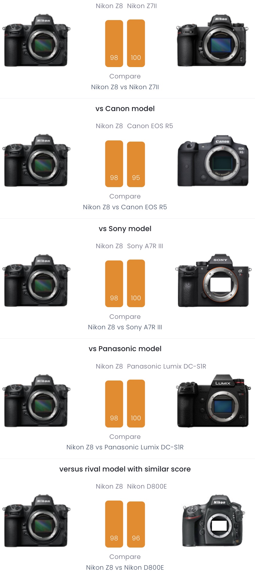 DxOMark released their Nikon Z8 camera sensor test results. Here are some comparisons with other cameras: