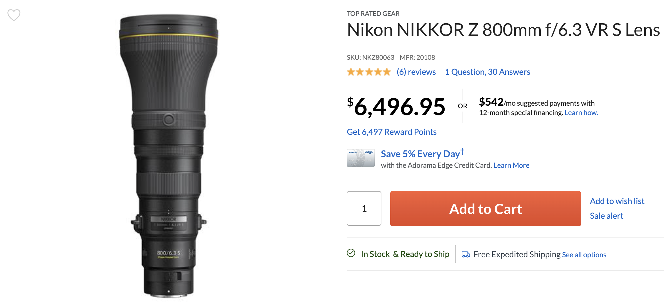 In addition to the Nikon Z8, the NIKKOR Z 800mm f/6.3 VR S lens is also back in stock at: