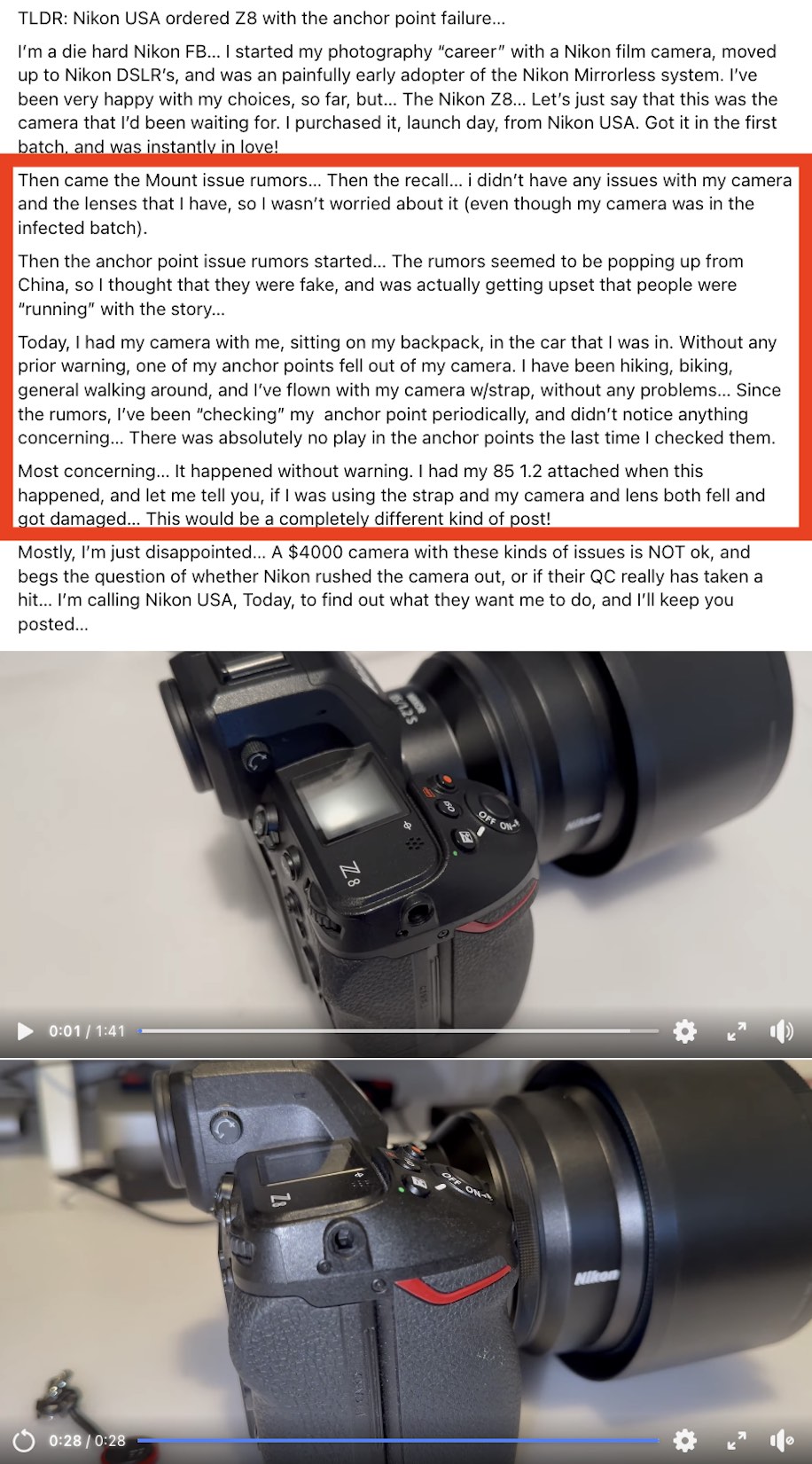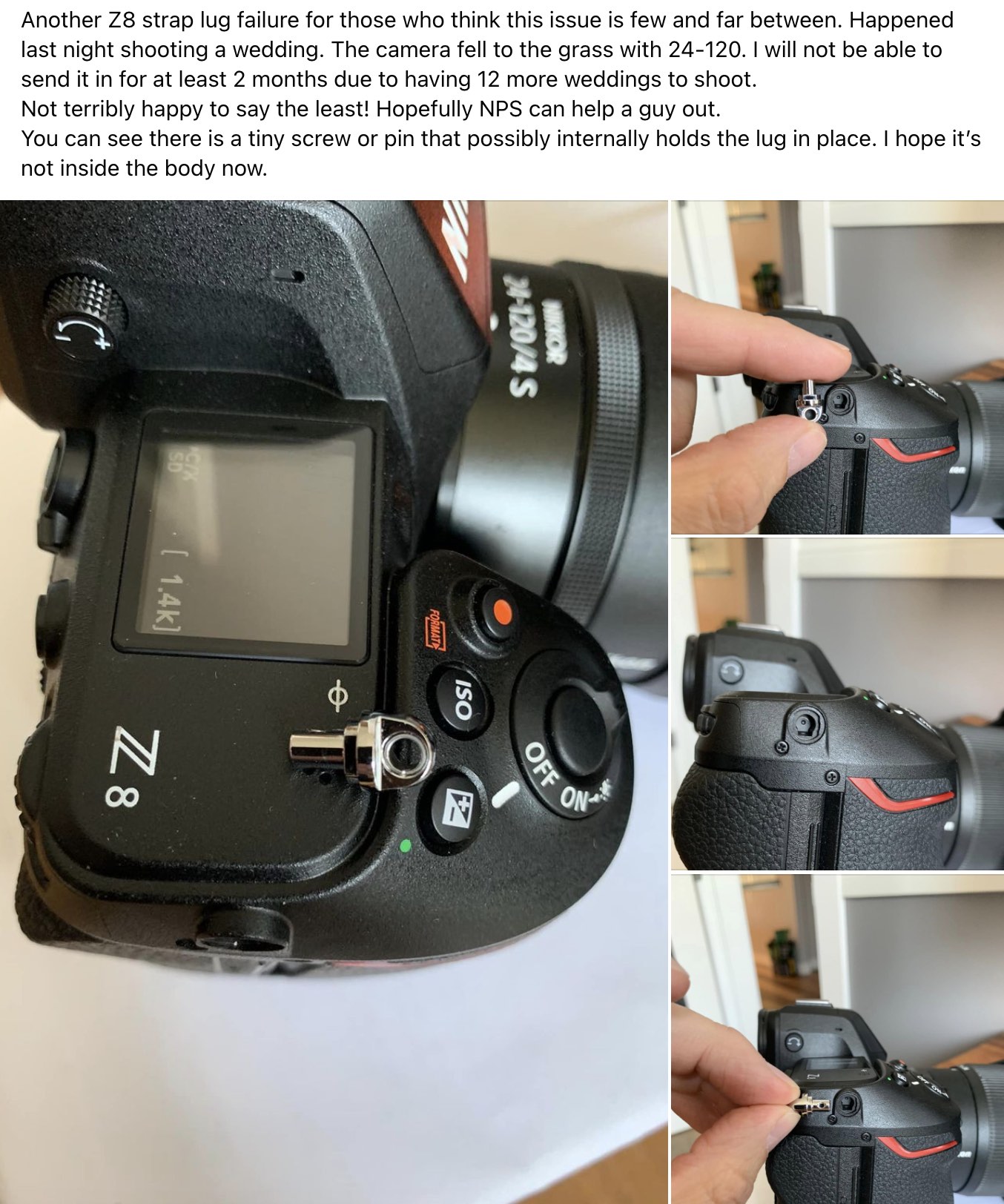 Another confirmed with two videos Nikon Z8 strap lug failure was reported on the Nikon Z8 Facebook Group: