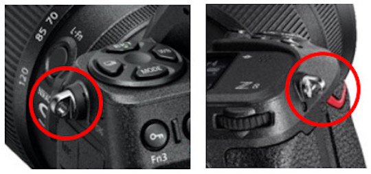 Nikon will service both of the left and right camera strap eyelets indicated in the images directly below.
