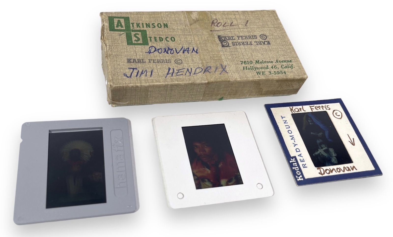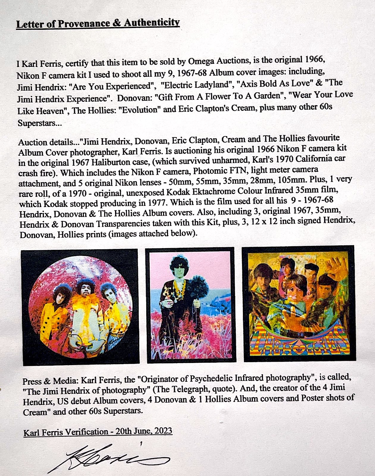 The Nikon F camera kit in original c 1960s Halliburton carry case, used c 1967-1969 by legendary Psychedelic photographer Karl Ferris, to shoot the famed US debut psychedelic album covers, of Jimi Hendrix ‘Are You Experienced’, ‘Electric Ladyland’, ‘Axis Bold as Love’ and ‘The Jimi Hendrix Experience’, as well as Donovan’s ‘Gift From a Flower to a Garden’. ‘Wear Your Love Like Heaven’ and The Hollies ‘Evolution’. Plus poster shots of Eric Clapton’s “Cream” group.