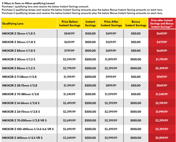 Let’s imagine that you’d like to purchase the Z-Series 24-70mm f/2.8 S and the 70-200mm f/2.8 S lenses: Each lens has an instant savings of $300 OFF, which = $600 OFF total! But for the fist time EVER, Nikon also has added BONUS savings of $100 per lens, when 2 or 3 qualifying lenses are purchased together. Total savings on these 2 lenses (purchased together) is now $800 OFF Total!
