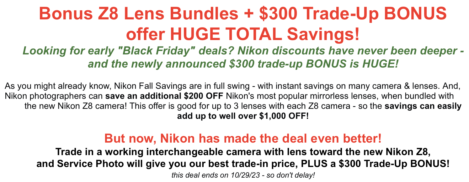 Nikon USA added an additional $300 trade-in-bonus offer when purchasing a Nikon Z8 camera or Z8 lens kit (valid until November 29th). Check this B&H Photo page for additional information: