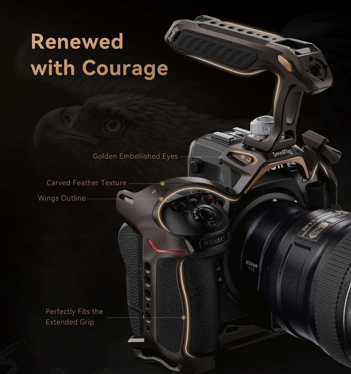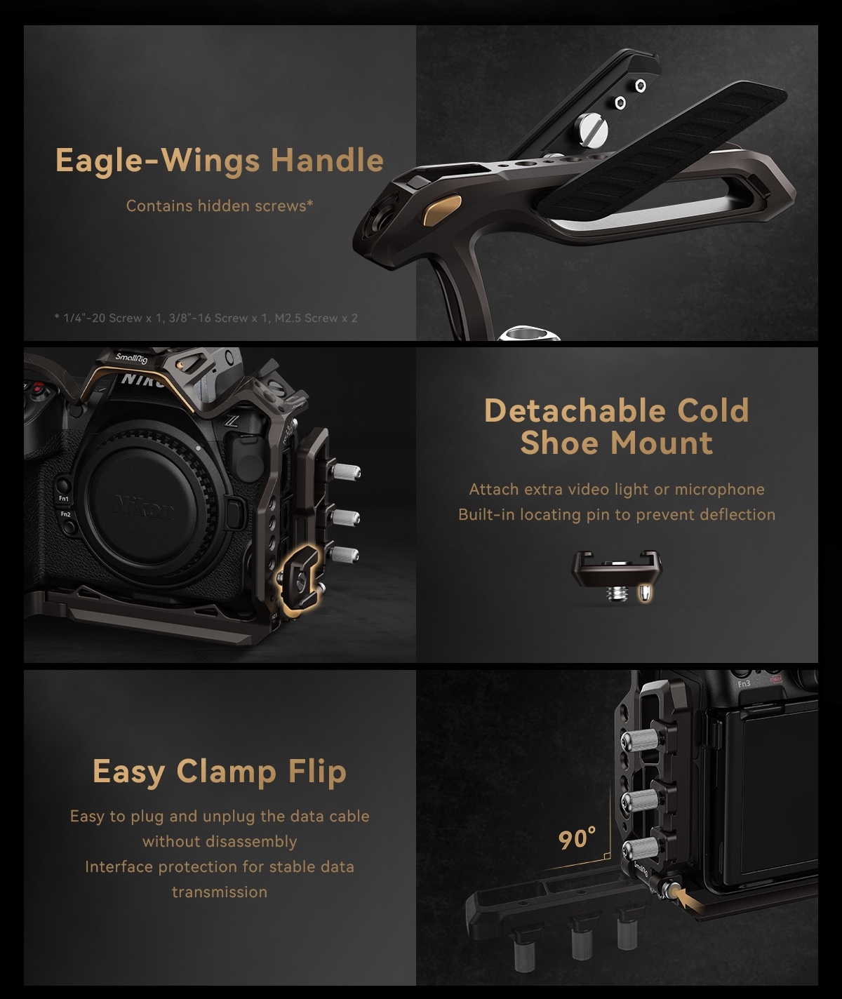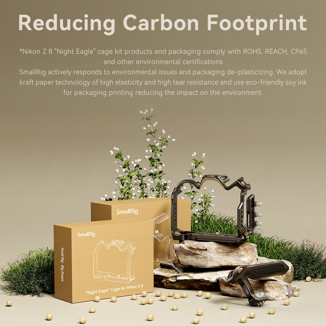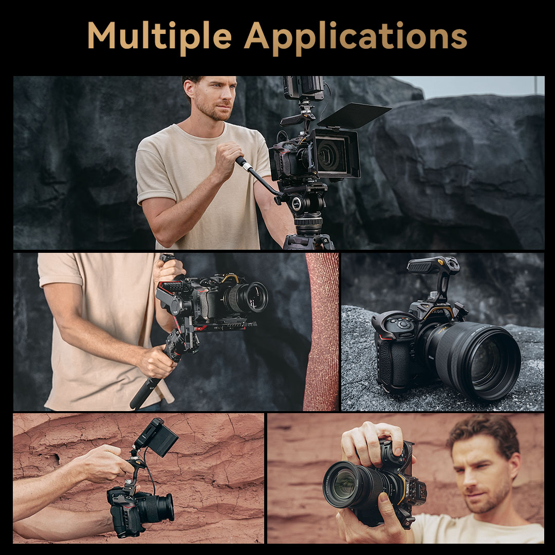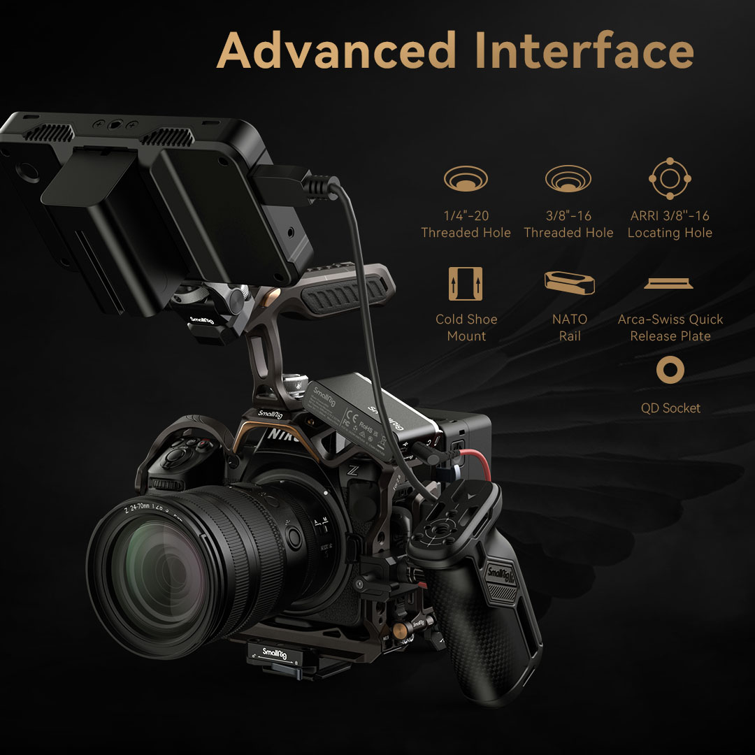 “SmallRig “Night Eagle” Cage Kit for Nikon Z 8 4317 is designed to provide creators with a comfortable low-angle shooting experience, protect the camera, and expand the interface with a variety of accessories. The kit includes a cage, a top handle, an HDMI & USB-C cable clamp, and a cold shoe mount. The cage features a brand-new design: gun brown curves interspersed with gold to supplement the classic style of the Nikon Z 8. The new press and flip design of the cable clamp allows you to open the interface cover without disassembling it to save time. It also prevents accidental cable disconnection and ensures stable transmission. The detachable Cold Shoe Mount can be installed on both sides and the top of the cage and is fitted with a positioning pin to prevent deflection. The detachable Cold Shoe Mount can be used to expand the LED video lights, microphones, etc. And the ergonomically designed handle brings you a comfortable grip experience and contains hidden 1/4″-20 screw, 3/8″-16 screw, and two M2.5 screws. The kit has a variety of built-in expansion interfaces, such as 1/4″-20 Threaded Hole, 3/8″-16 Threaded Hole, ARRI 3/8”-16 Locating Hole, Cold Shoe Mount, NATO Rail, Arca-Swiss Quick Release Plate, QD Port, etc. It also supports magic arms, side handles, top handles, rod clamps, bottom plates, LED video lights, microphones, etc.”