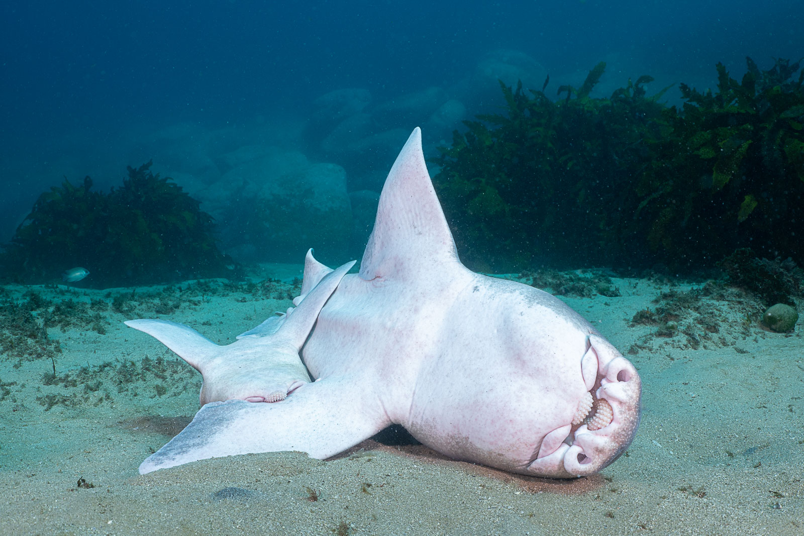 Port Jackson sharks upside down while mating. Their bellies are easily overexposed and I thought my strobes had burnt them out. The Z8 files are very malleable, however, and I could recover all the details in post-processing (Nikon Z8, Nauticam NA-Z8, Nikon Z 24–50mm f/4–6.3 at 34mm, Nauticam WWL-C, dual Ikelite DS230, f/13, 1/80s, ISO 320)