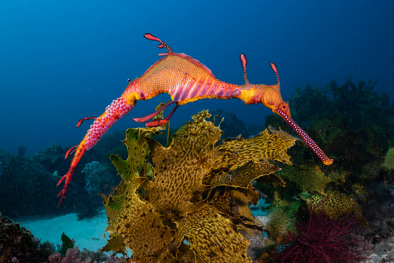One of my favorite optics is the Nauticam WWL-C: when mounted in front of the Nikon Z 24-50mm lens, it covers a 130°–84° range of field-of-view, which is suited to large animals and mid-sized marine life, such as this weedy seadragon (Nikon Z8, Nauticam NA-Z8, Nikon Z 24–50mm f/4–6.3 at 28mm, Nauticam WWL-C, dual Ikelite DS230, f/13, 1/100s, ISO 320).