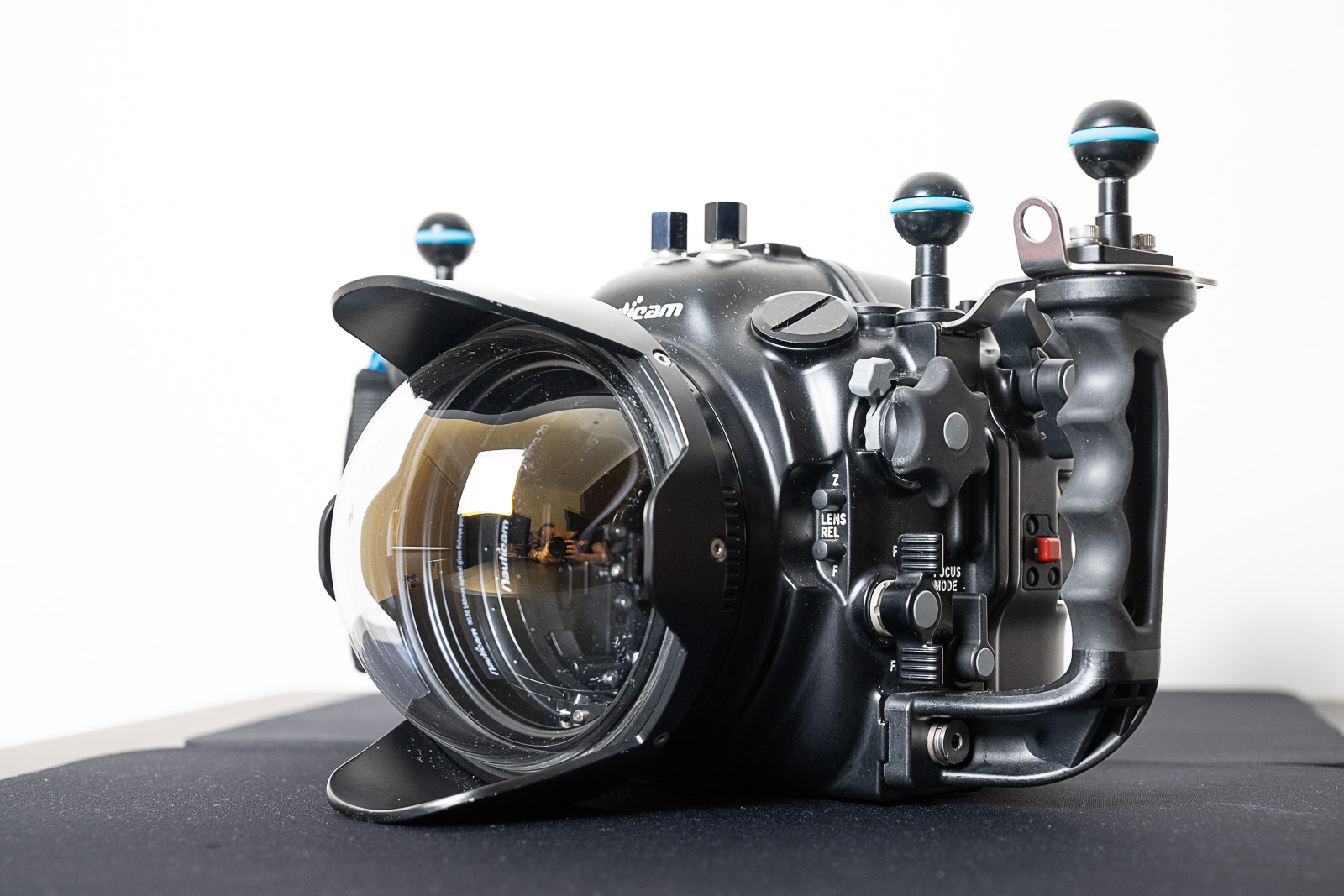- Flexible customizability of controls, accessible via eight ergonomic levers on the Nauticam housing; battery lasts for two busy dives.