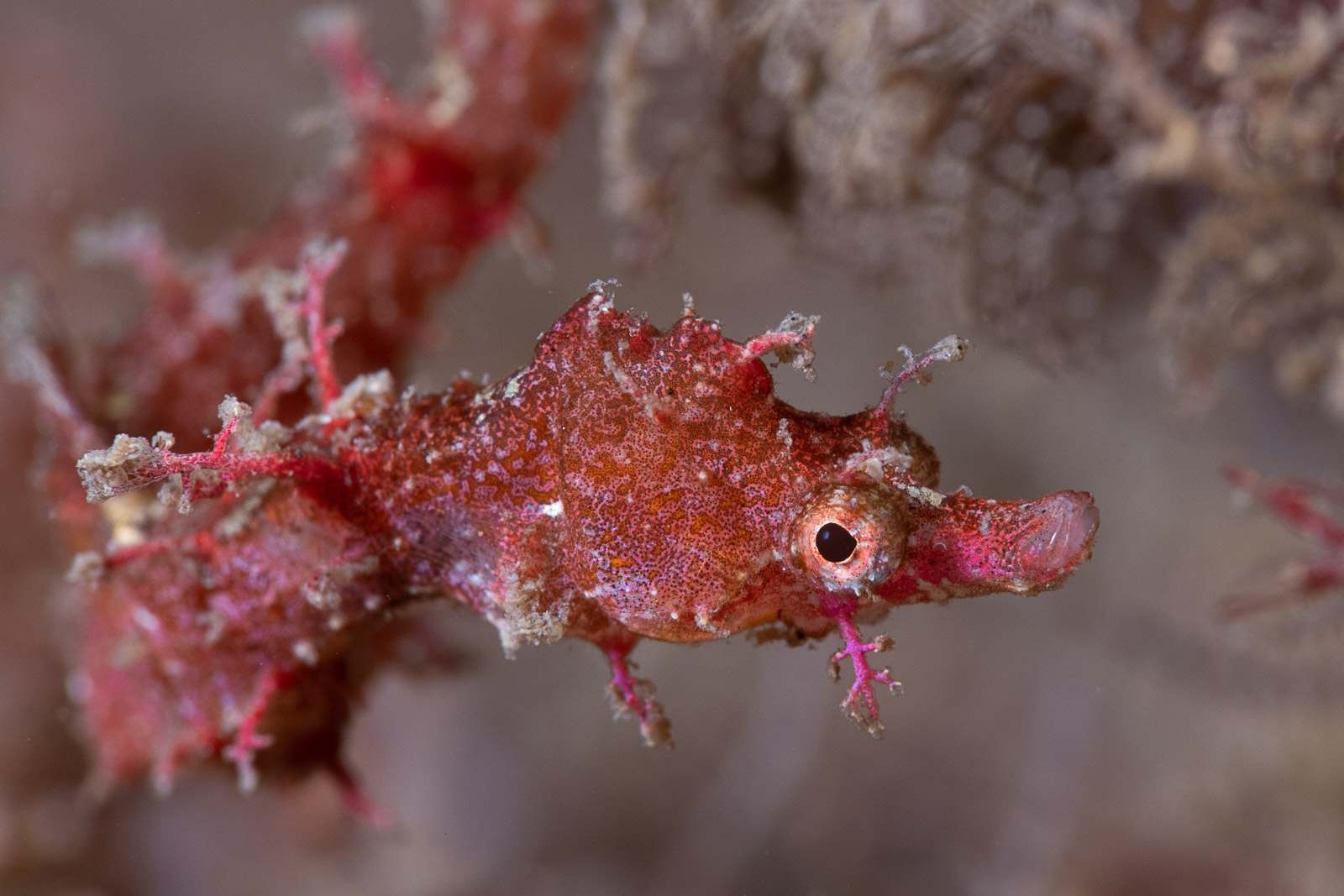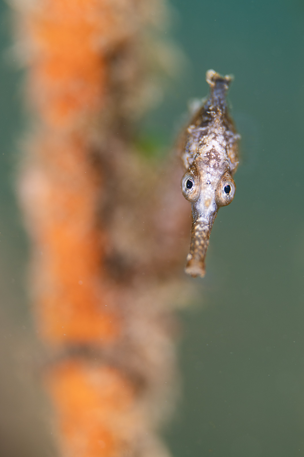 Juvenile White’s seahorse on an artificial reef: With visibility of less than 5 meters (16 feet), I could select the seahorse from a distance, then approach and recompose at the same time, while the Z8 kept tracking the eye (Nikon Z8, Nauticam NA-Z8, Nikon Z 105mm f/2.8, dual Retra Flash Pro, f/5.6, 1/80s, ISO 100).