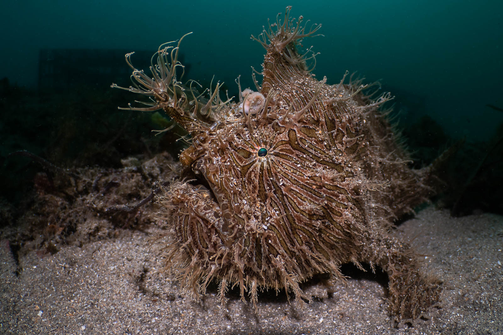 Striated anglerfish (hairy frogfish): without the modified Z 105mm lens, a workaround was to position my AF focus point slightly in front of the eye, which worked reasonably well in getting me critical sharpness, where I needed it (Nikon Z8, Nauticam NA-Z8, Nikon Z 105mm f/2.8, Nauticam EMWL with 160° optic, Retra Flash Pro, Retra LSD, f/18, 1/200s, ISO 320).