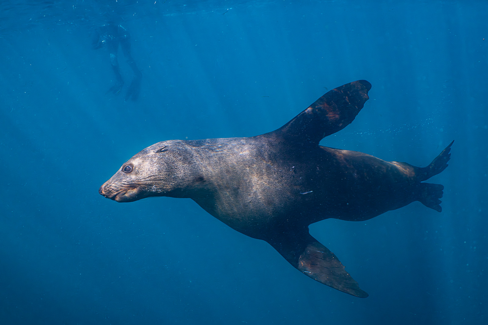 Shooting at 20fps allowed me to get one shot when the super-fast fur seal and the diver were nicely balanced in the composition (Nikon Z8, Nauticam NA-Z8, Nikon Z 24–50mm f/4–6.3 at 50mm, Nauticam WWL-C, ambient light, f/11, 1/640s, ISO 1800).