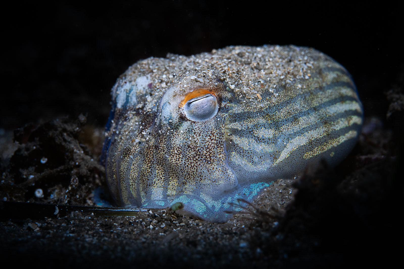 Striped pyjama squid at night: With high-contrast subjects like this pyjama squid, the autofocus (AF-S) still worked under my red light, but it was slow and I reverted to white light as soon as the squid started moving (Nikon Z8, Nauticam NA-Z8, Nikon Z 105mm f/2.8, Retra Flash Pro, f/18, 1/200s, ISO 640).