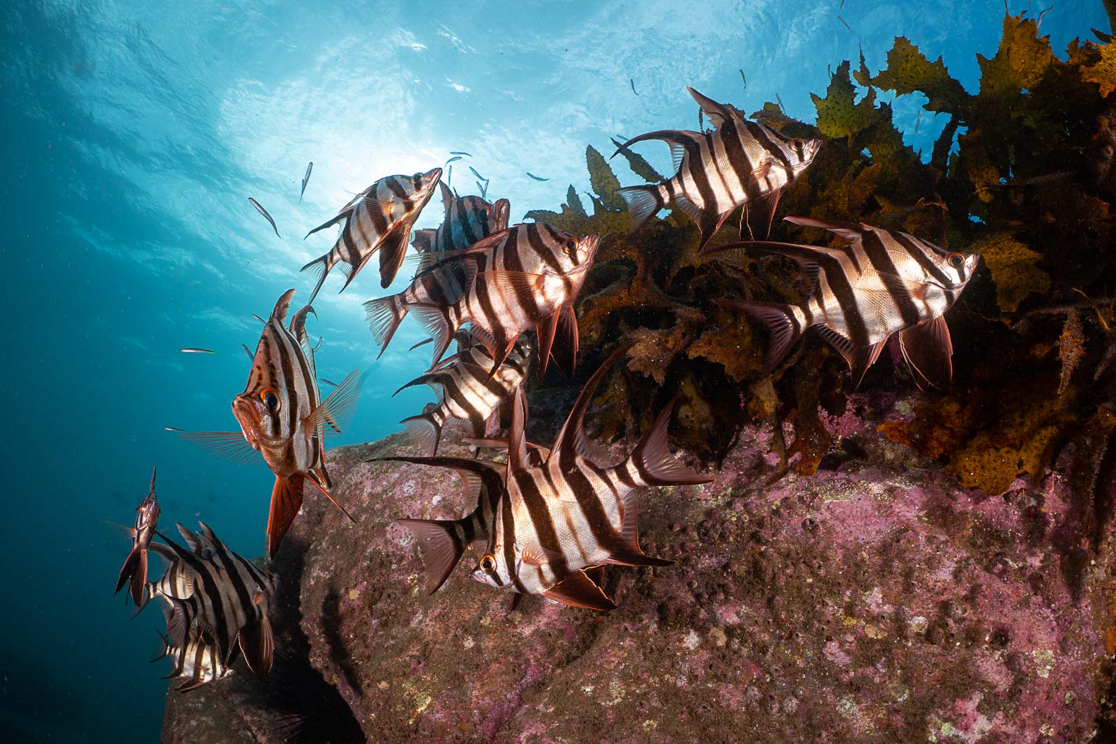 This is the sort of high-contrast scene where an EVF can’t show you everything. I was still able to see each of the old wives, but the water background near the sun was clipped (Nikon Z8, Nauticam NA-Z8, Nikon Z 24–50mm f/4–6.3 at 24mm, Nauticam WWL-C, dual Retra Flash Pro, f/13, 1/100s, ISO 200).