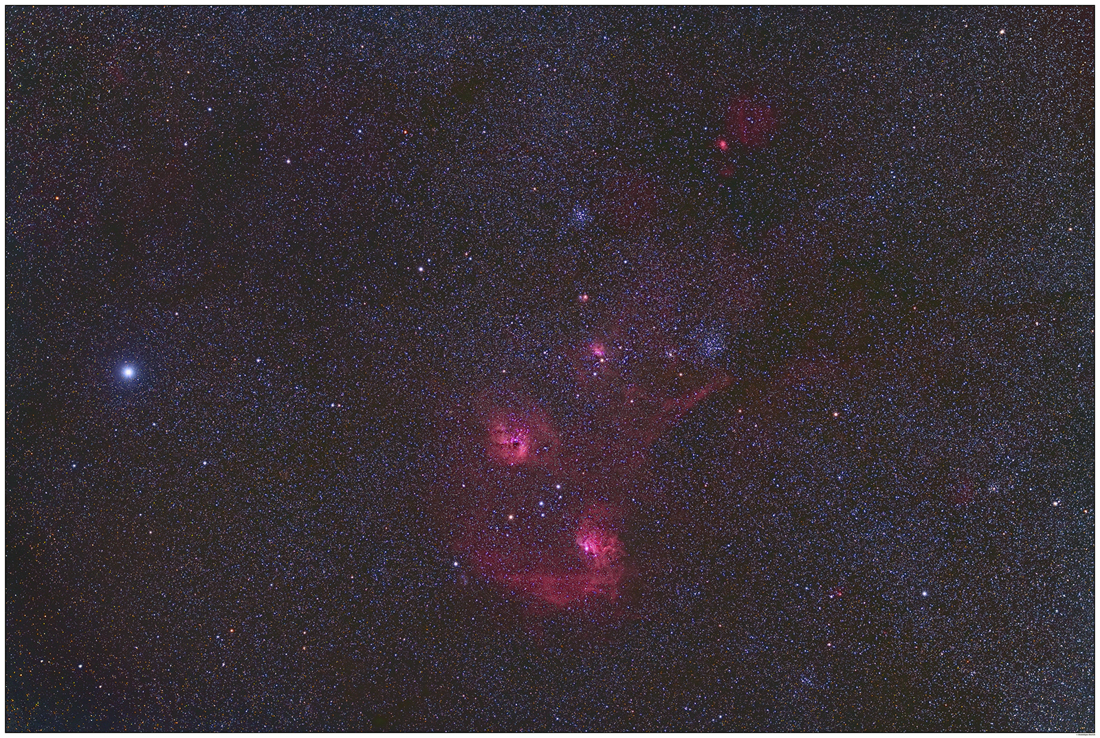 At first, an area in Auriga, showing the Flaming Star Nebula in typical Hydrogen Alpha colors, but also a few open star clusters in our galaxy. It was exposed for 90 minutes (45 x 2 minutes at ISO 800). No calibration frames (dark frames, flat frames) were used. I corrected the light pollution (always present in Belgium) and color balance in Nikon NX Studio, then stacked all images using the AstroPixel Processor software, removed the remaining light pollution gradient in the sky using the same software, and finally enhanced contrast and colors in Adobe Photoshop CC: