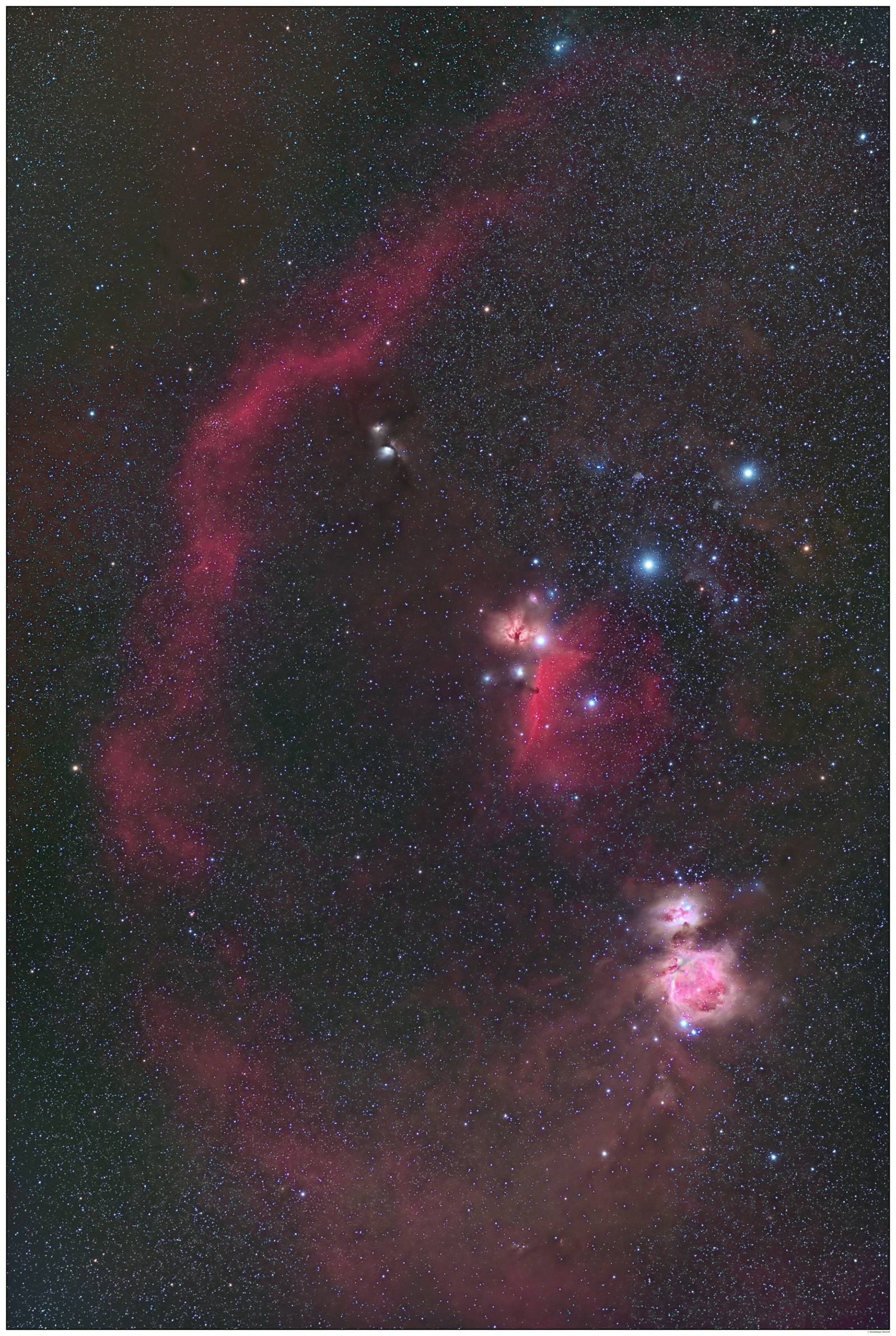 The second image is of the well-known constellation Orion. Or at least part of it. It shows the Horsehead Nebula, the Great Orion Nebula, and the enormous structure named Barnard’s Loop (after an American pioneer in astrophotography). Here the exposure was 210 minutes and the processing was done as the first image.