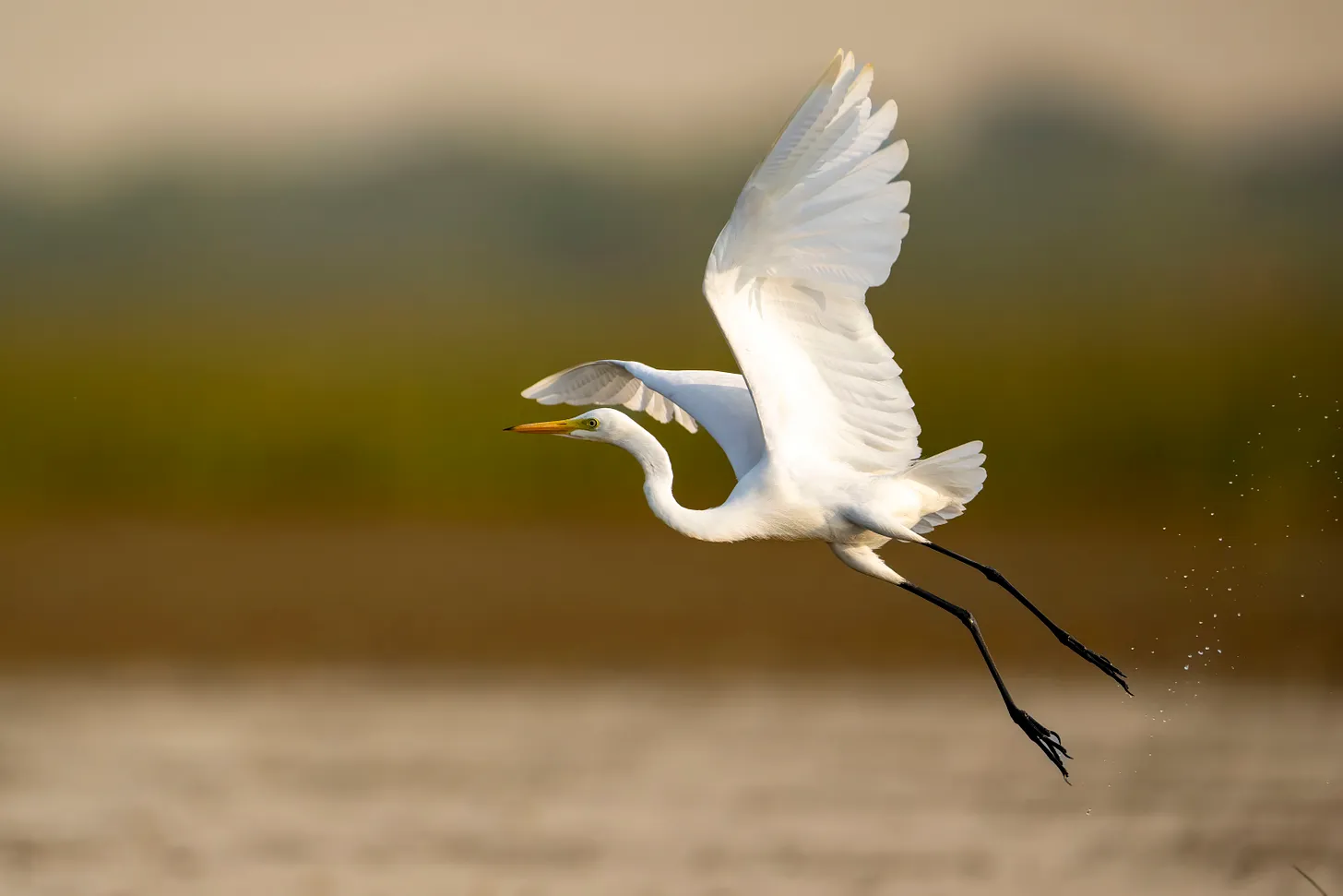 A Great Egret in flight is a study in poise and grace. The contrast of its immaculate white feathers against the sanctuary’s landscape, along with the finesse of its flight, is accentuated in the soft light of evening, offering a snapshot of tranquility.