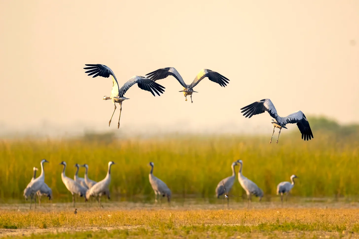 The Sarus Crane, the tallest flying bird, is seen here in a communal display, emphasizing the sanctuary’s importance as a gathering place for these majestic creatures. The image captures the essence of their social behavior, set against the backdrop of a golden sunset, creating a stunning visual narrative of life in Nalsarovar.