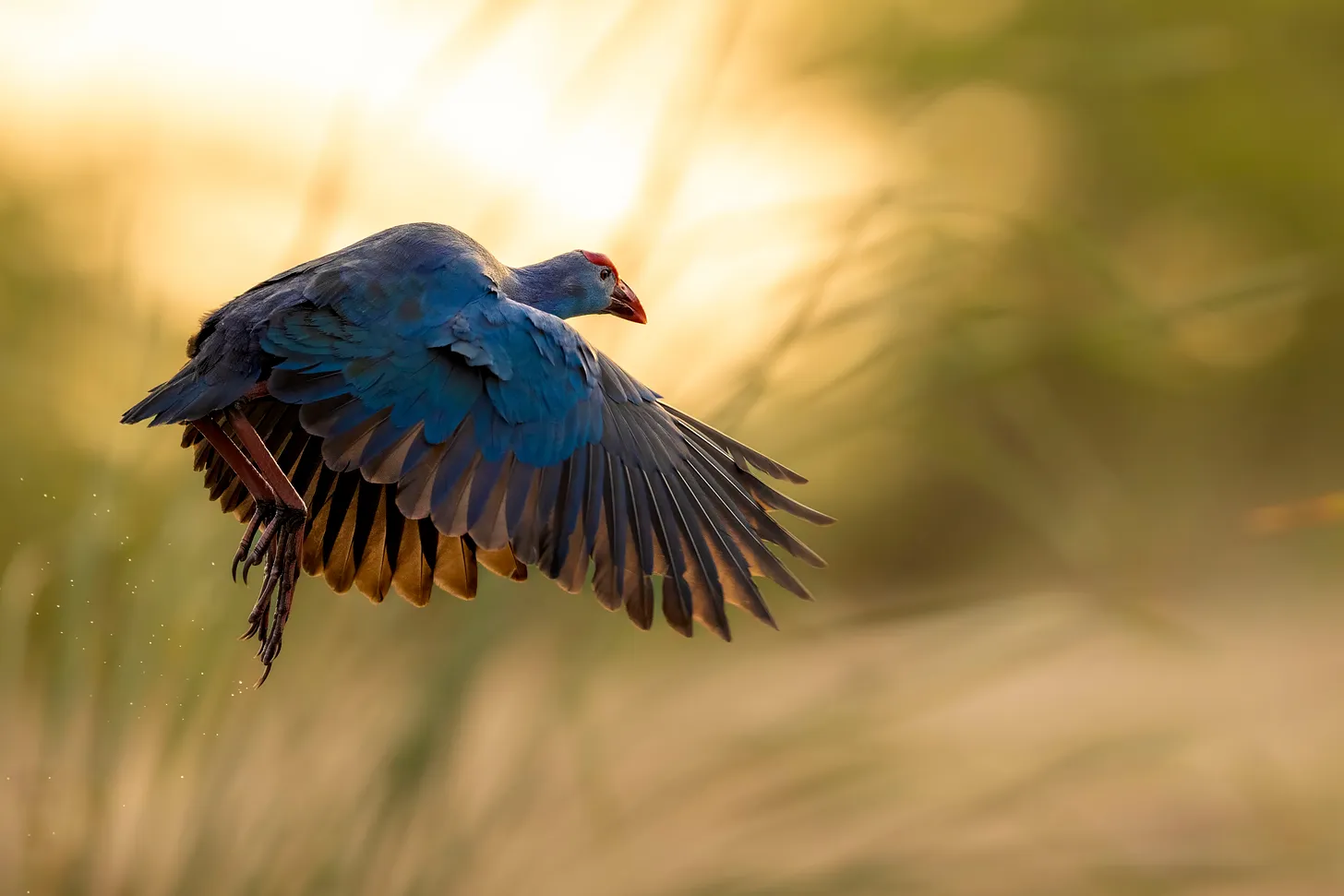 In this captivating image, a Purple Swamphen is seen in full flight, its wings unfurled and feet trailing behind, creating a beautiful contrast with the warm, golden backlight of the setting sun. The sunlight filters through the bird’s feathers, revealing a spectrum of blue and rusty hues. Water droplets, perhaps from a recent foray into the water, are visible against the subtle bokeh of light, adding a dynamic element to the image. This image is a stunning portrayal of the bird’s power and grace, showcasing the beauty of avian life in motion.