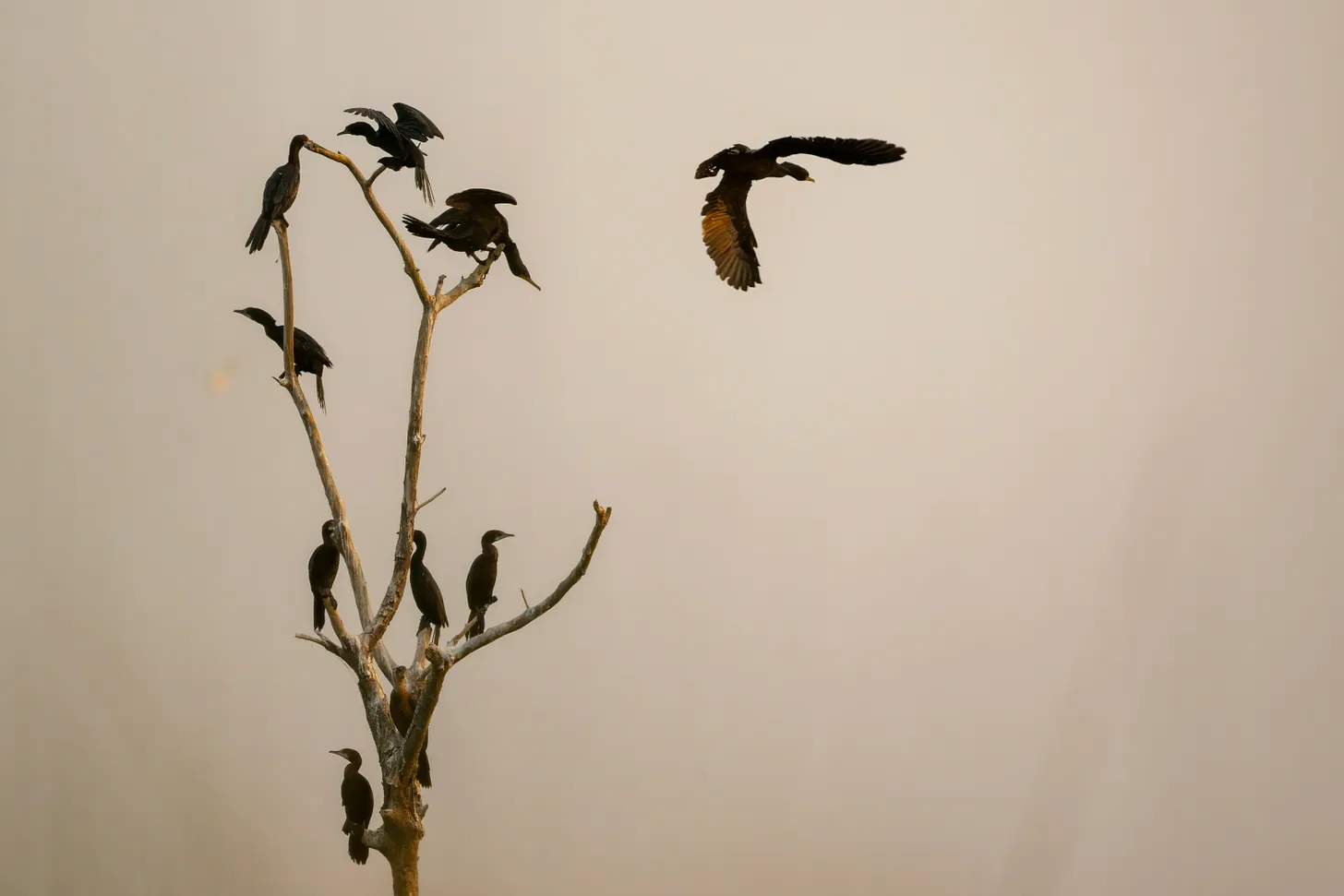 In this serene image, a group of cormorants perches gracefully on the bare branches of a tree, silhouetted against a muted sky. The scene captures a single bird in mid-flight, its wings spread wide, symbolizing the freedom and dynamism of wildlife. The stillness of the other birds contrasts beautifully with this moment of action, creating a harmonious blend of movement and tranquility. This picture, with its soft lighting and minimalist composition, evokes a sense of calm and reflects the quiet majesty of the natural world.