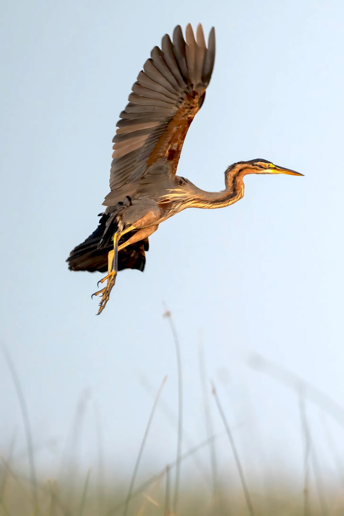 The Purple Heron, captured mid-flight, extends its wings, showcasing a tapestry of rich colors against the sanctuary’s clear skies. The image, taken in the early morning, reveals the bird’s striking form as it glides gracefully through the air, its elongated body highlighted by the golden sunlight.