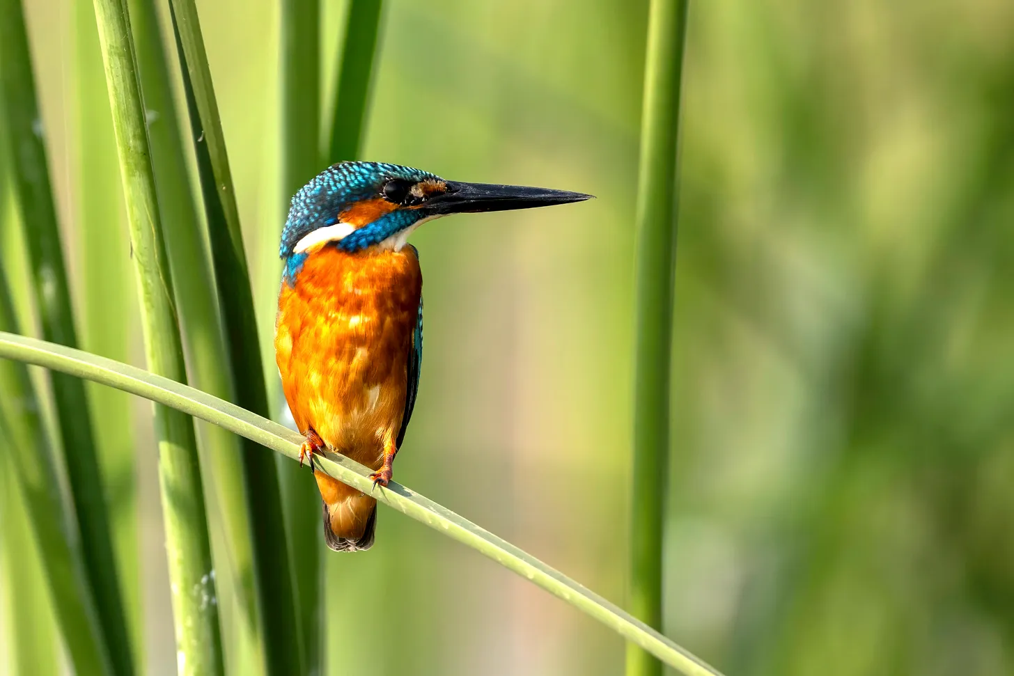 The Common Kingfisher, perched delicately on a reed, is a splash of brilliance with its vivid blue and orange plumage. The calmness of the late afternoon offers a soft light that accentuates the bird’s focused gaze and the intricate details of its feathers.