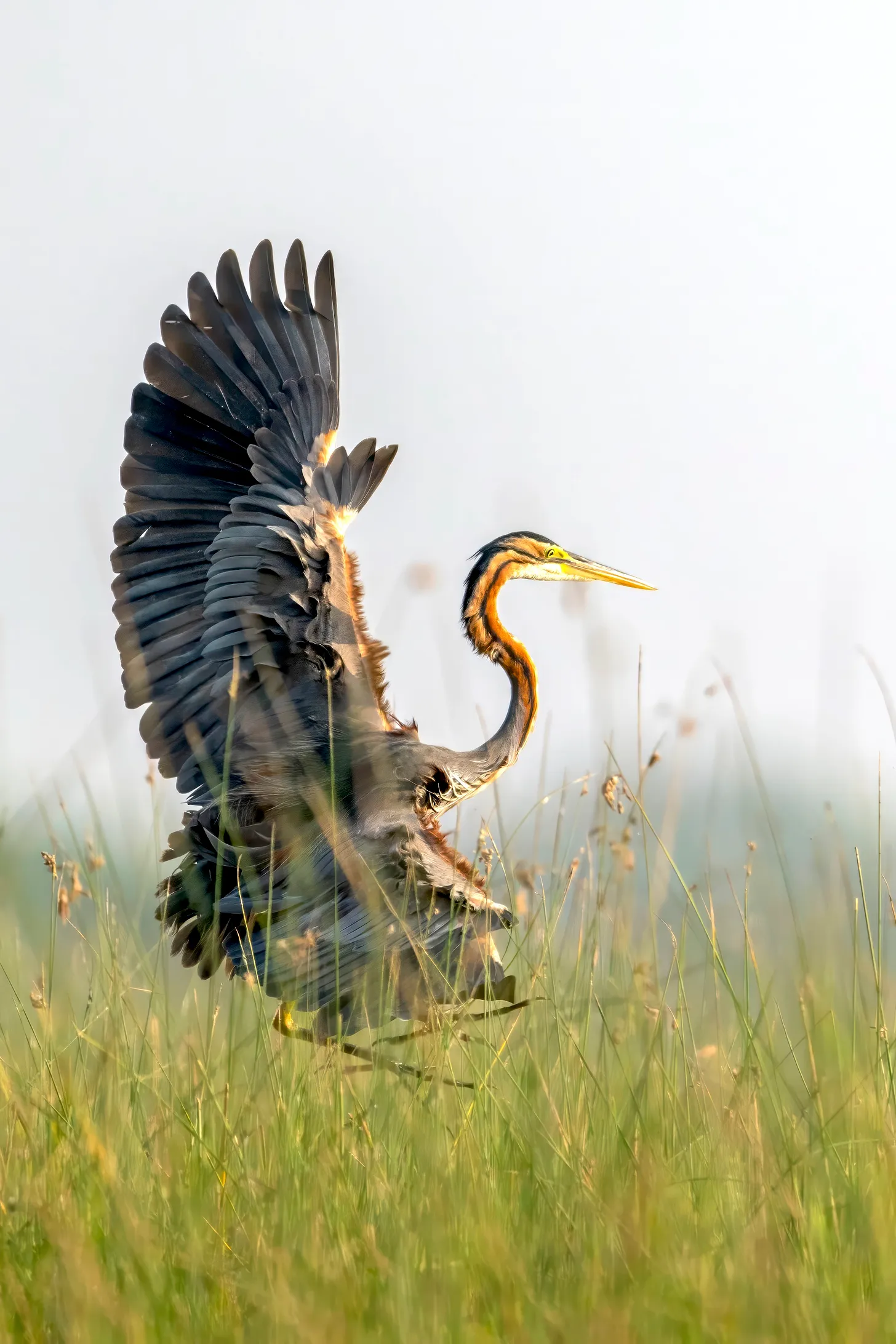 With wings outstretched, a Purple Heron prepares to take to the skies, its feathers bathed in the warm glow of the sun. This photograph captures a moment of elegant anticipation, highlighting the heron’s poised grace as it stands amidst the sanctuary’s natural landscape, ready to ascend into the vast sky above