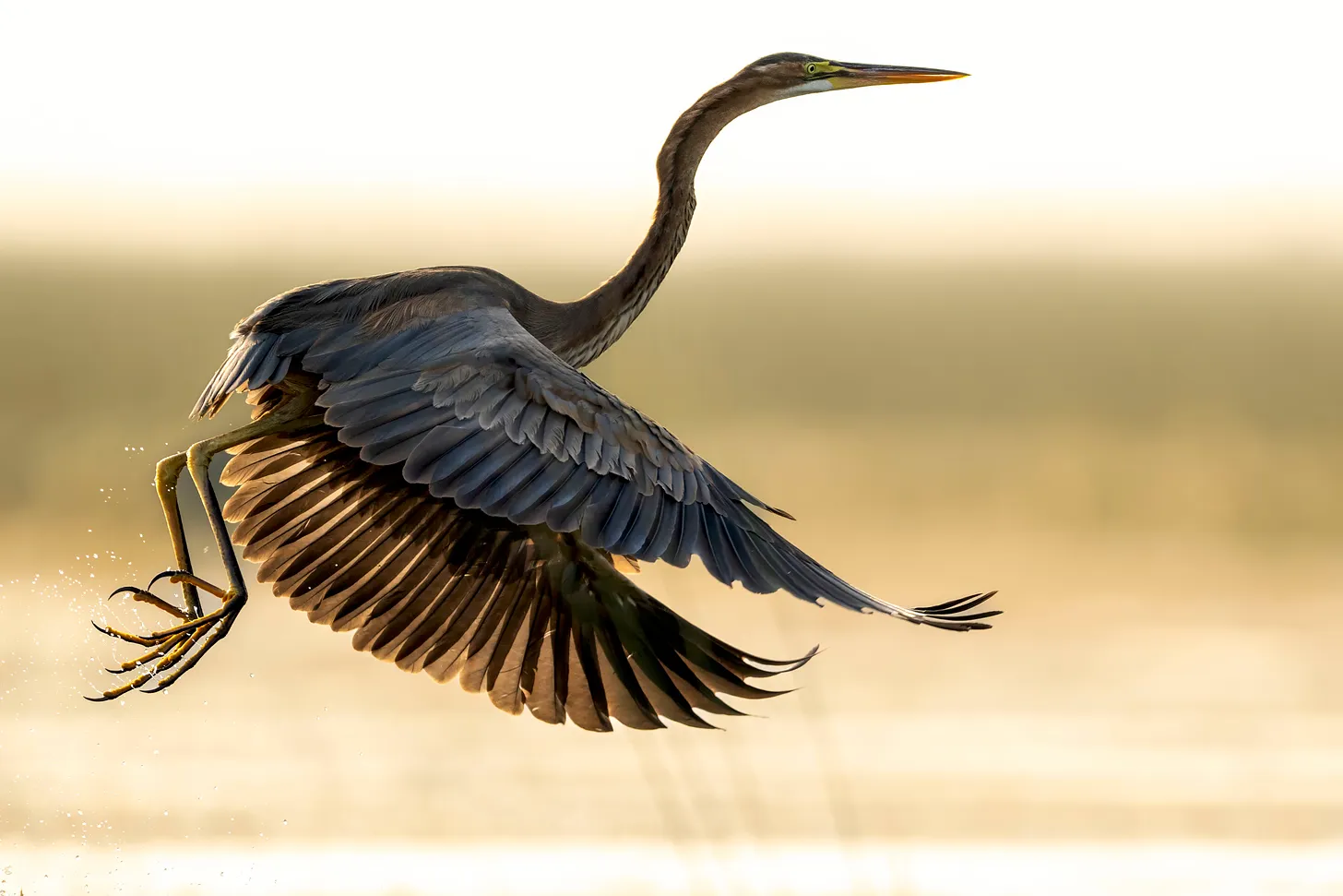 The Grey Heron, captured in the act of takeoff, is a spectacle of natural power and grace. Water droplets cascade from its long legs, testament to the bird’s recent departure from the water below. The soft light of dusk illuminates its detailed grey plumage, accentuating the elegance of its extended neck and the strength in its wings as it begins its ascent, embodying the vibrant life within the sanctuary.