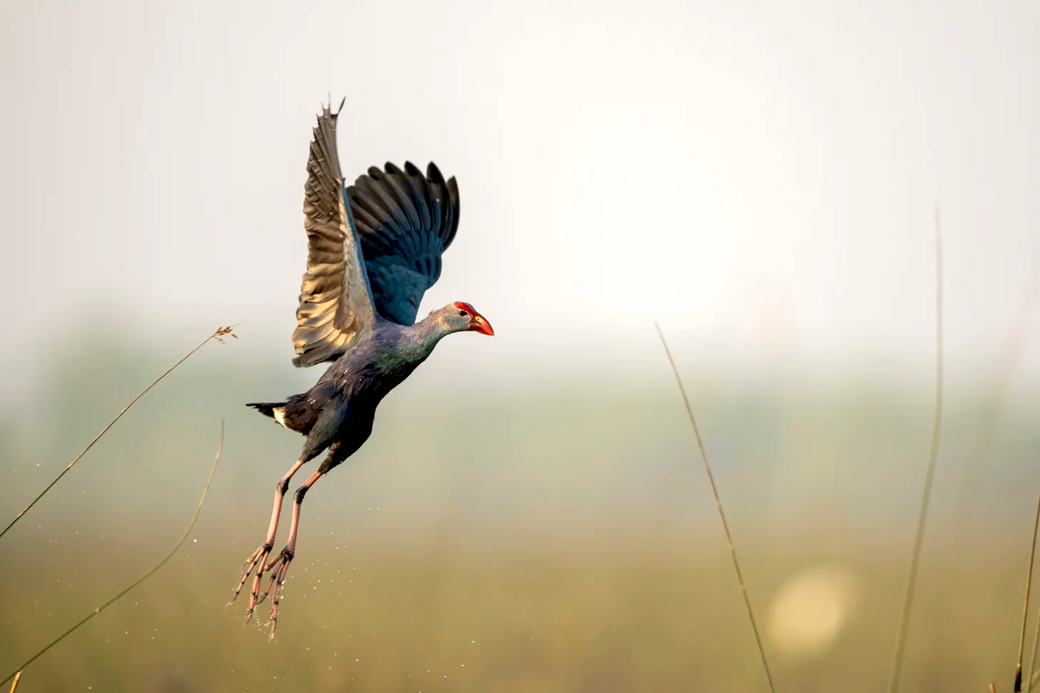 A Purple Swamphen, with its iridescent blue feathers, takes off amidst the lush greenery, a burst of color that embodies the vibrancy of the wetlands. The backdrop of the rising sun casts a golden light on the scene, emphasizing the bird’s dynamic movement and the vitality of its habitat.