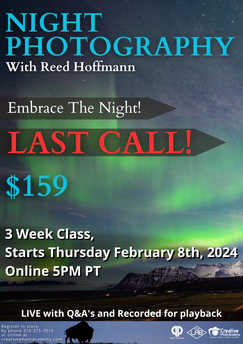 - Lunch with Jeff and Mark (free): Wednesday, Feb 7, noon Pacific Time at Paul’s Photo. Bring your lunch. All in-person participants will receive a free gift. Sorry, this event cannot be recorded.