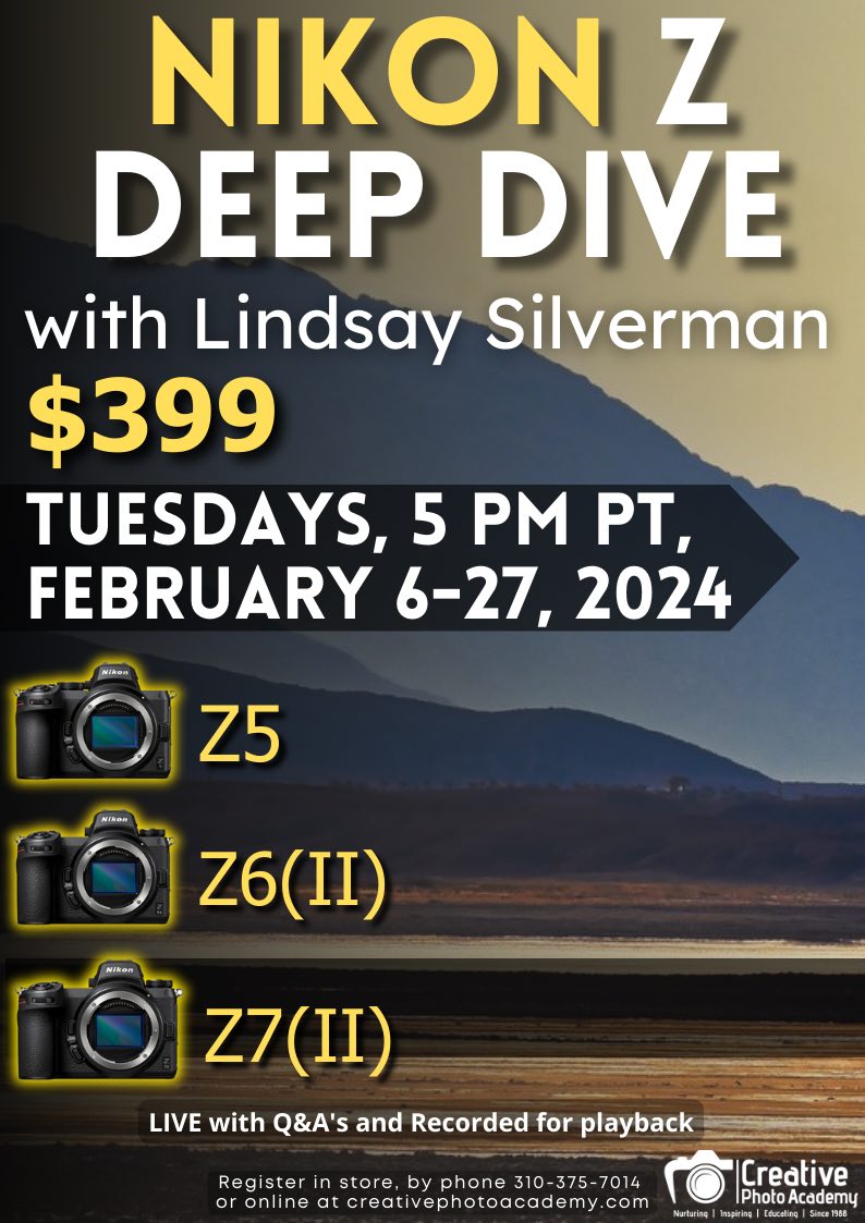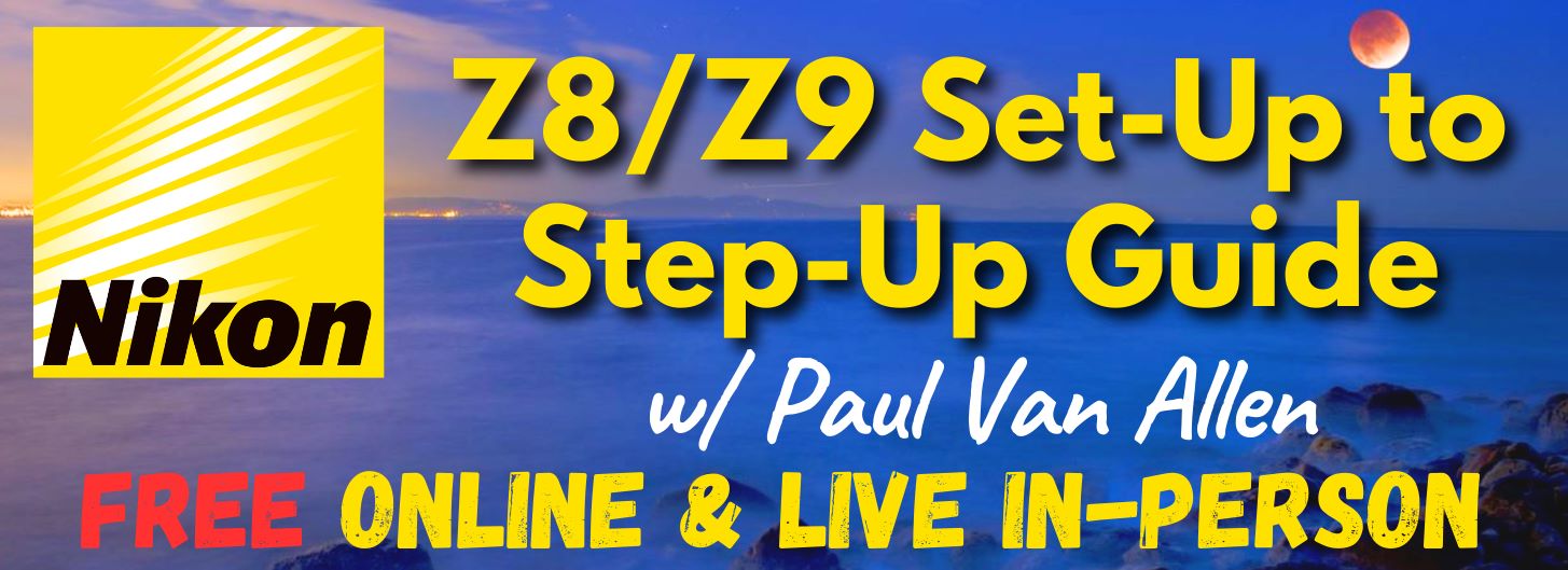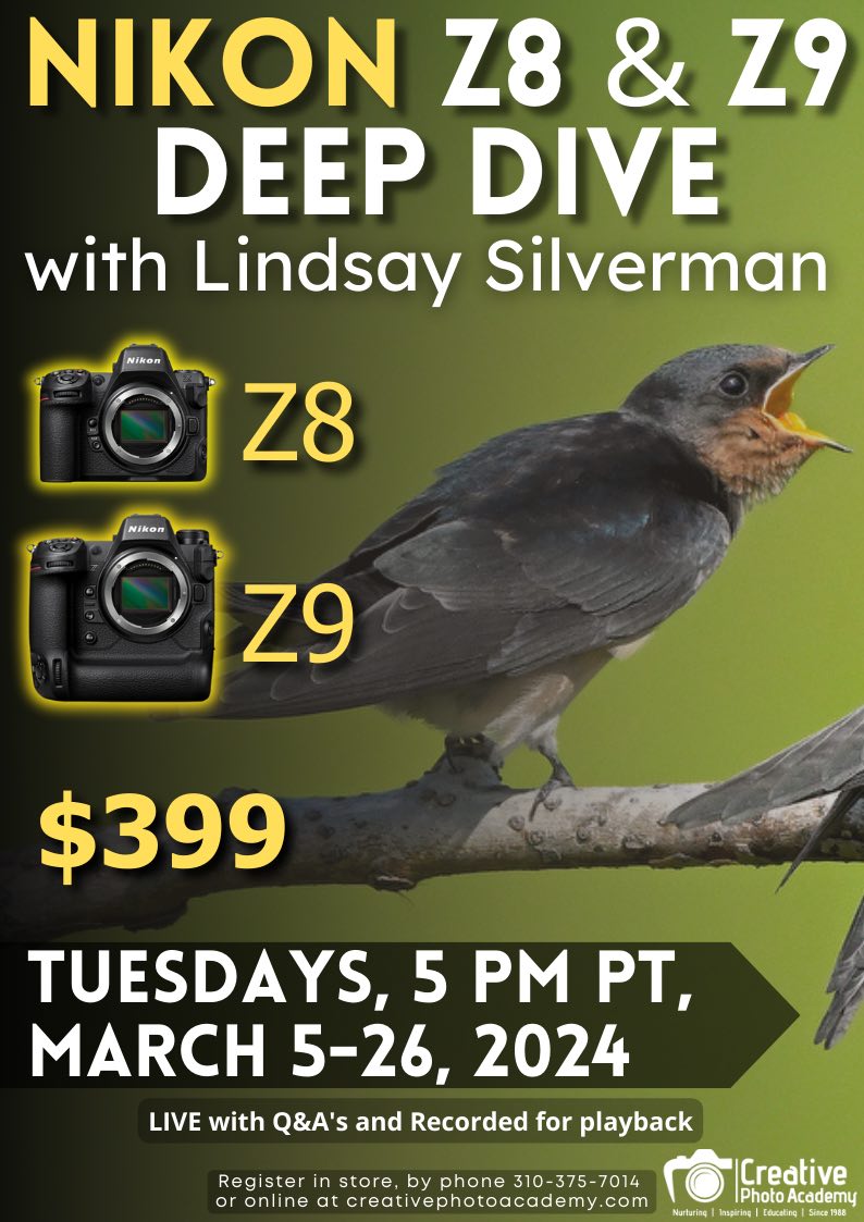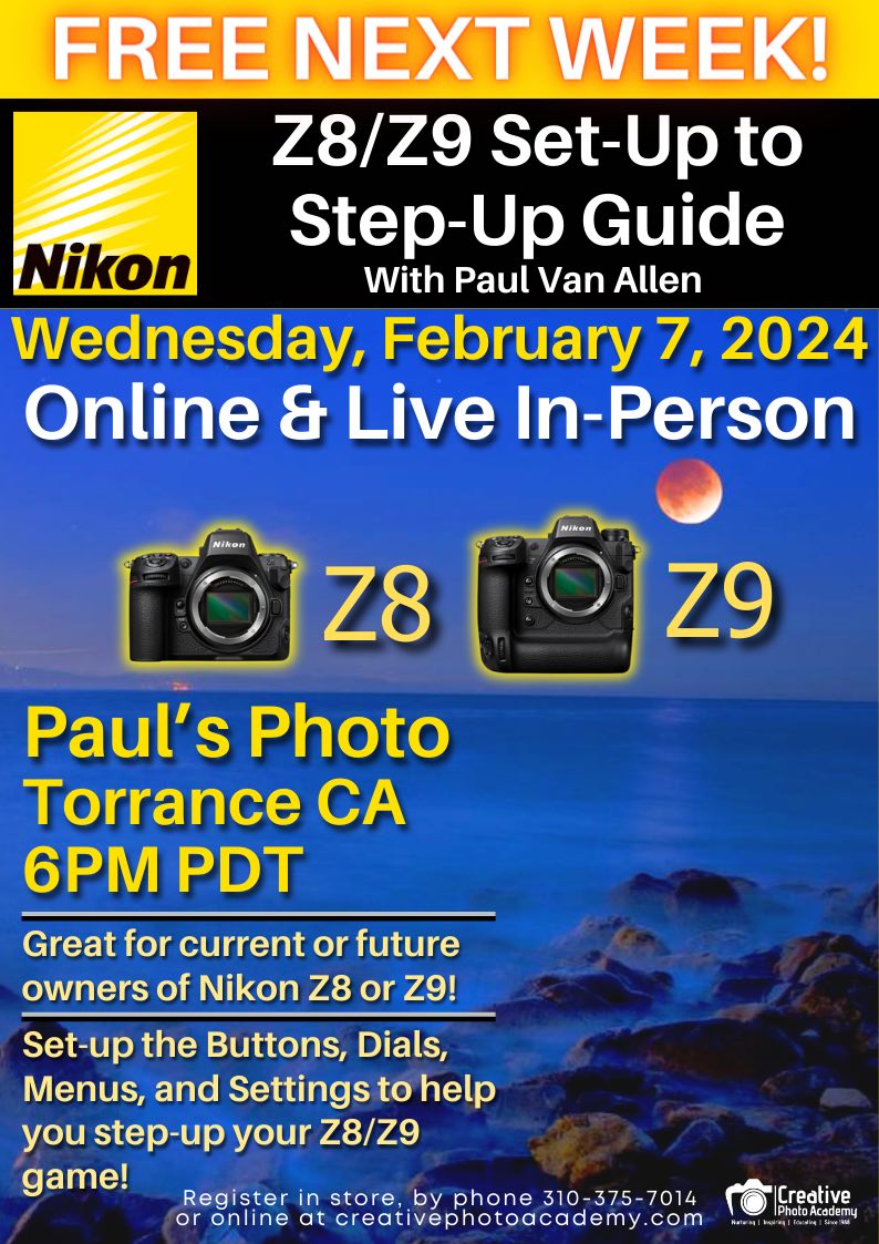 - Nikon Z8 + Z9 setup guide (free): Feb 7, 2024, 6-8 pm Pacific time (in-person sold out, online available).