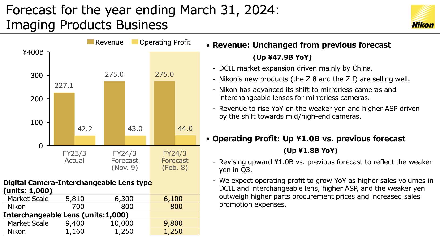 - Revenue to rise Yoy on the weaker yen and higher ASP driven by the shift towards mid/high-end cameras.