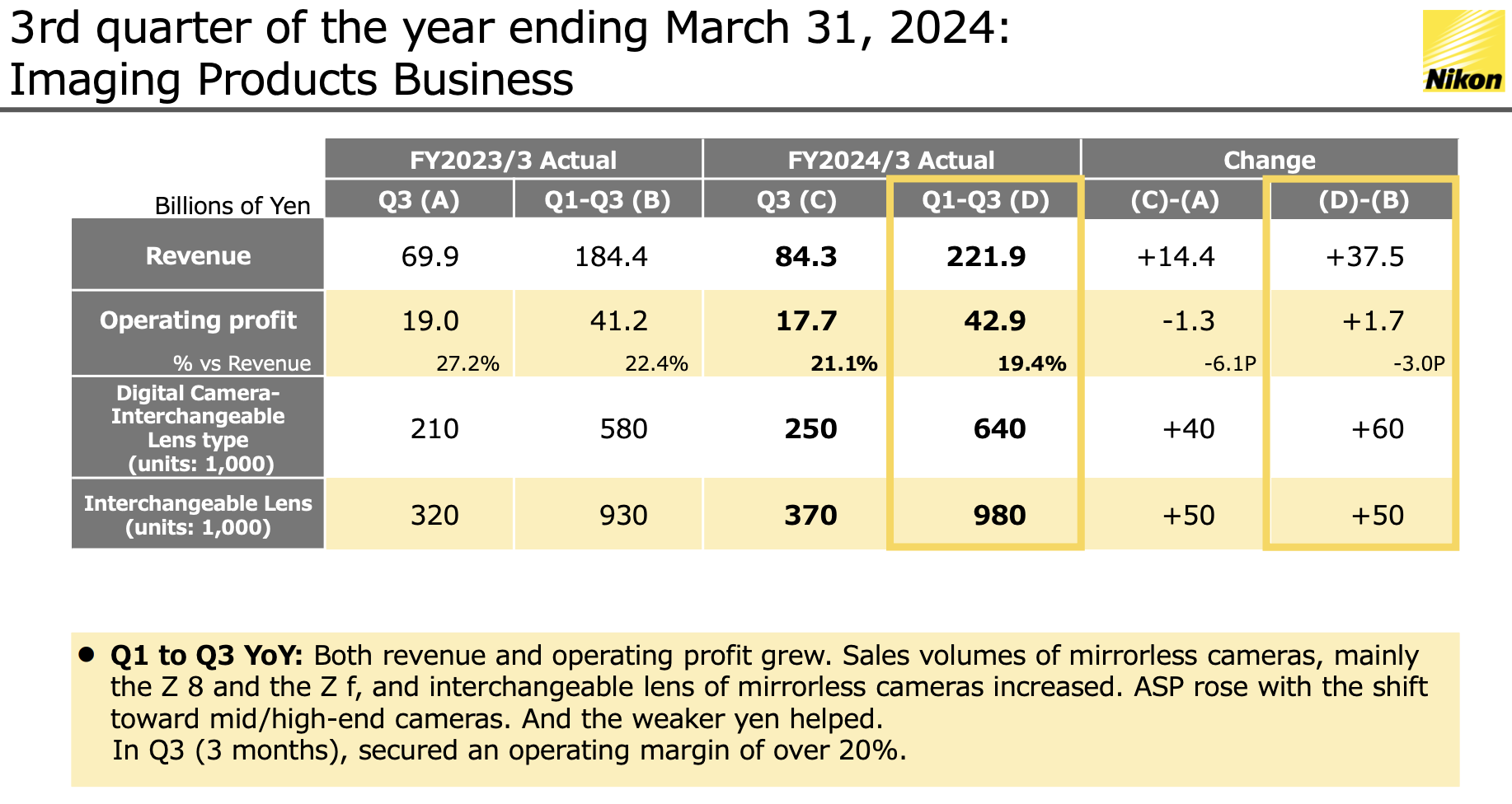 - Both revenue and operating profit grew. Sales volumes of mirrorless cameras, mainly the Z 8 and the Z f, and interchangeable lens of mirrorless cameras increased.