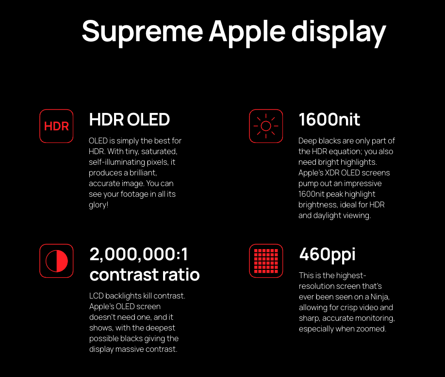 The display is a massive improvement over typical built-in screens that come with most cameras, boasting a 2,000,000:1 contrast ratio and supporting Dolby Vision, HDR10, and HLG. It can display 11 stops of dynamic range with a peak brightness of 1600 nits, perfect for HDR and outdoor viewing.