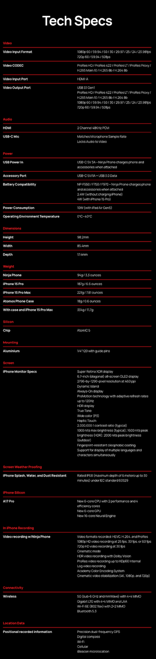 The first release of Ninja Phone, demonstrated at NAB 2024 at the Atomos booth (C4931) is designed for iPhone 15 Pro and iPhone 15 Pro Max and their amazing OLED display. It’s a powerful combination that uses Atomos’ world-beating knowledge of Apple ProRes encoding and Apple’s cutting-edge silicon and screen technology to create the world’s most beautiful, portable, and connected professional monitor-recorder.