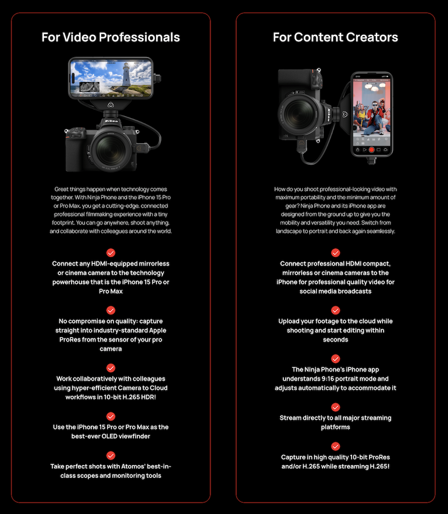 “We’ve added professional video and cinematic smarts to the world’s most advanced phone,” says Atomos CEO and Co-Founder Jeromy Young. “Ninja Phone is for the thousands of content creators who capture, store, and share video from their iPhone 15 Pro but aspire to work with professional cameras, lenses, and microphones. At the same time, the Ninja Phone is a perfect tool for longer-form professionals who want to adopt a cloud workflow without a complex and expensive technology footprint.”