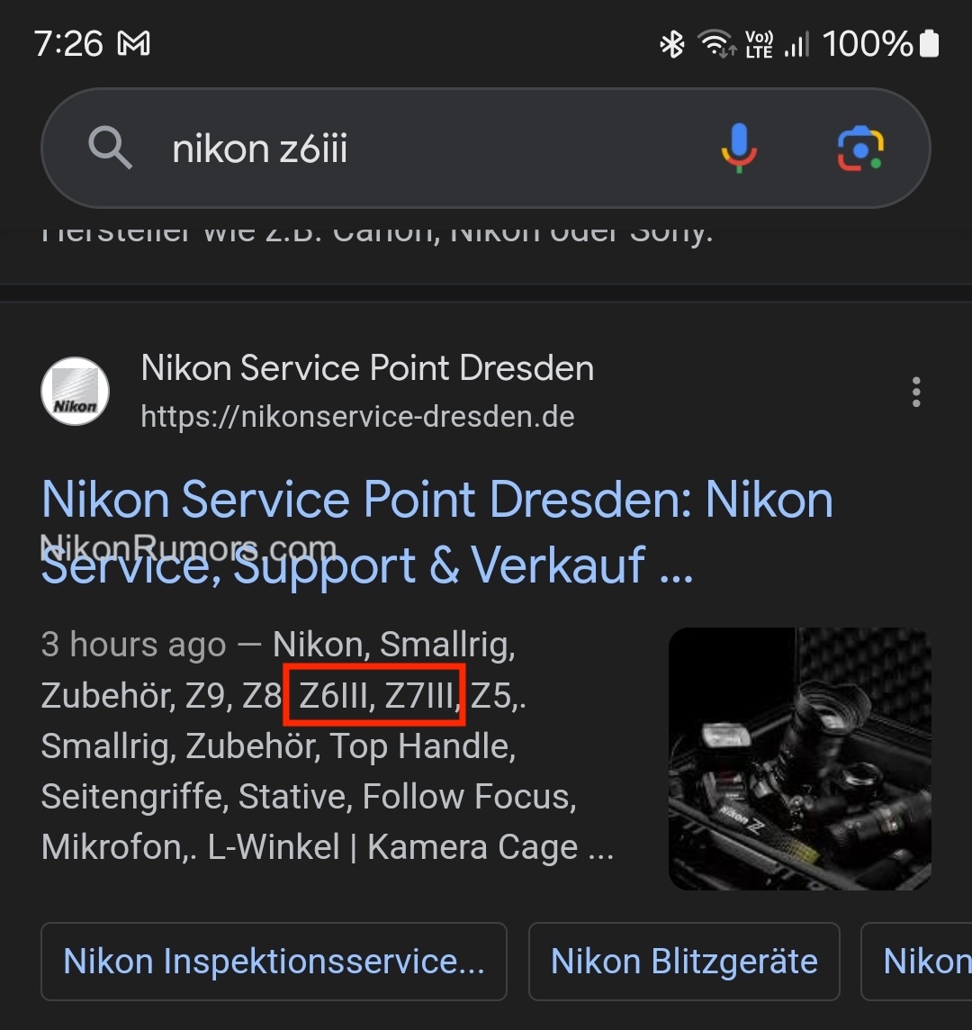 Nikon Service Dresden already lists the Z6III and Z7III cameras on Google search results in Germany: