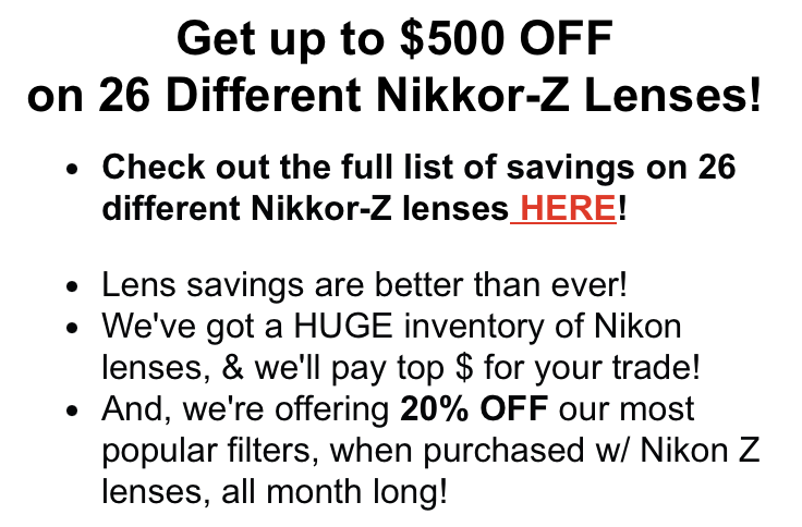 Other Nikon Z cameras will be up to $1,000 off. 26 different Nikkor Z lenses will get up to $500 off: