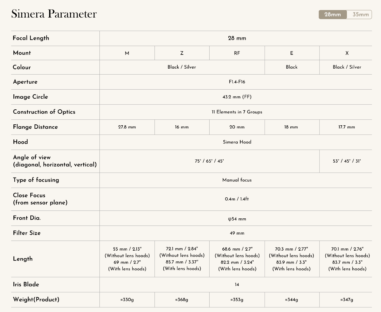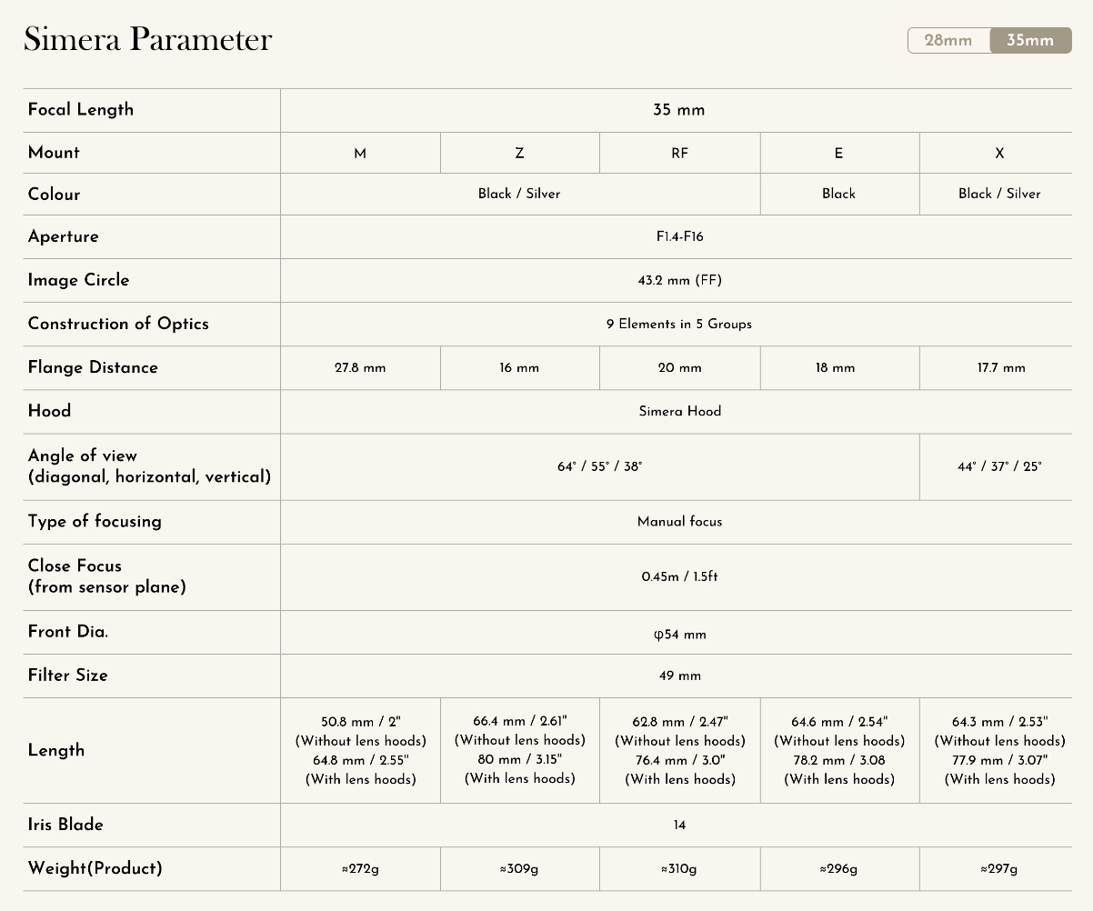 - 2.Simera 35mm f/1.4 and Simera 28mm f/1.4 for Z/E/X/RF mount have a constant maximum aperture of f/1.4 and a constant minimum focusing distance of 0.45m and 0.4m. Photographers are therefore able to achieve beautifully blurred backgrounds and crisp subjects in low-lighting conditions as well. Both lenses feature built-in floating elements (FLE) to ensure optimal image performance at close distances, delivering sharp imaging from center to edge and conveying subtle narrative texture.