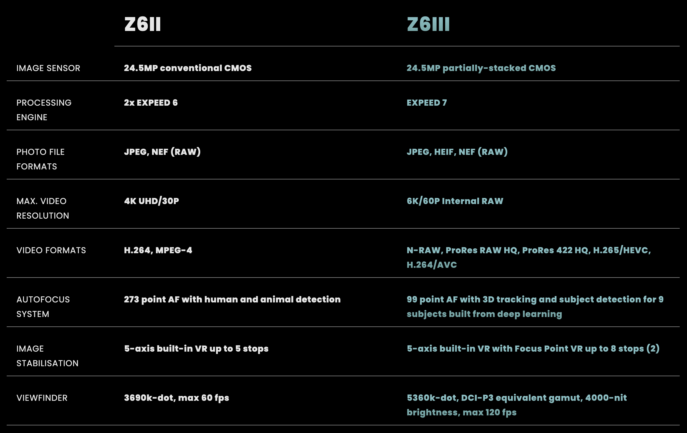 Nikon Z6 II vs. Nikon Z6 III specifications comparison – click on this page for a full-length view: